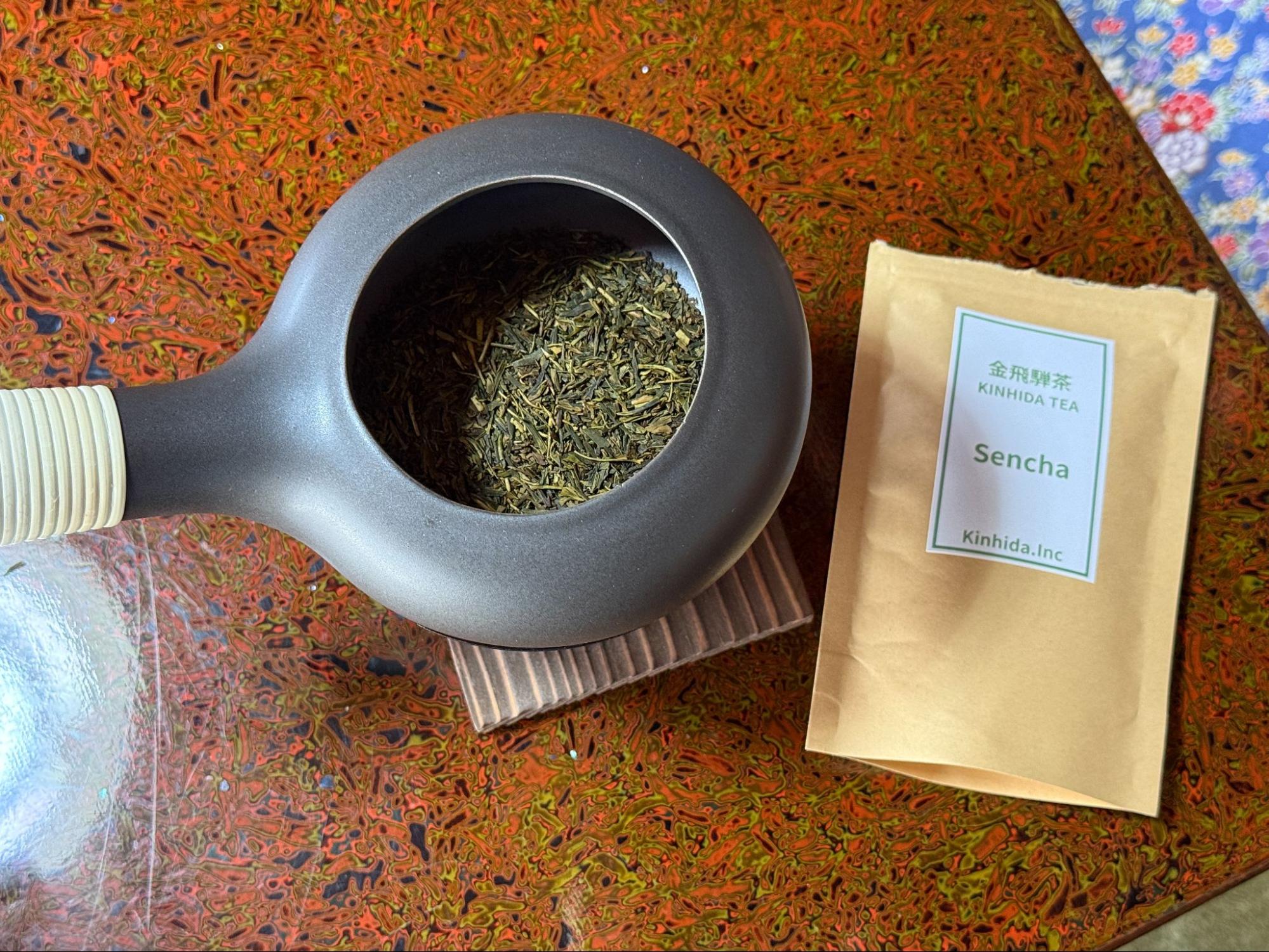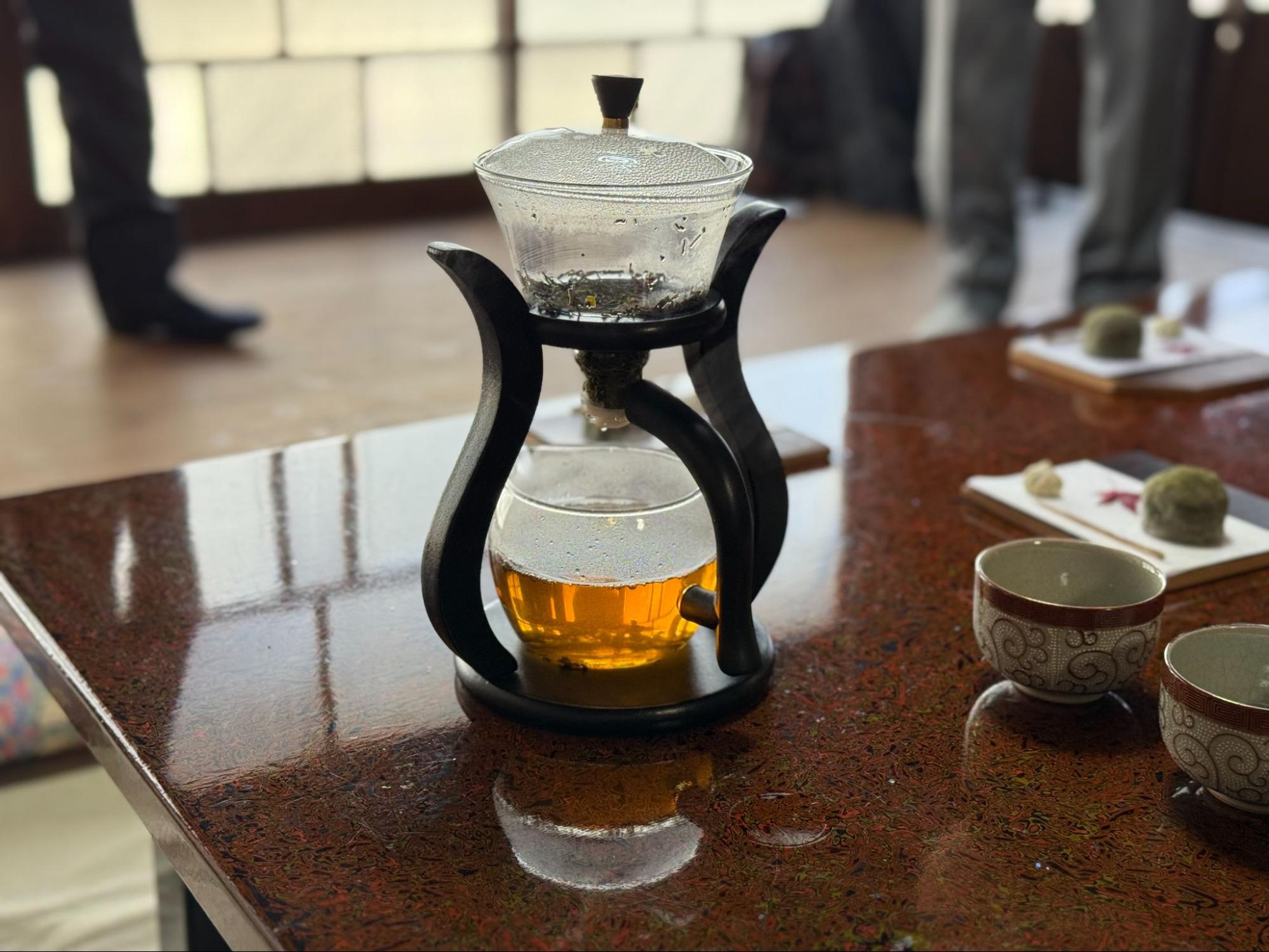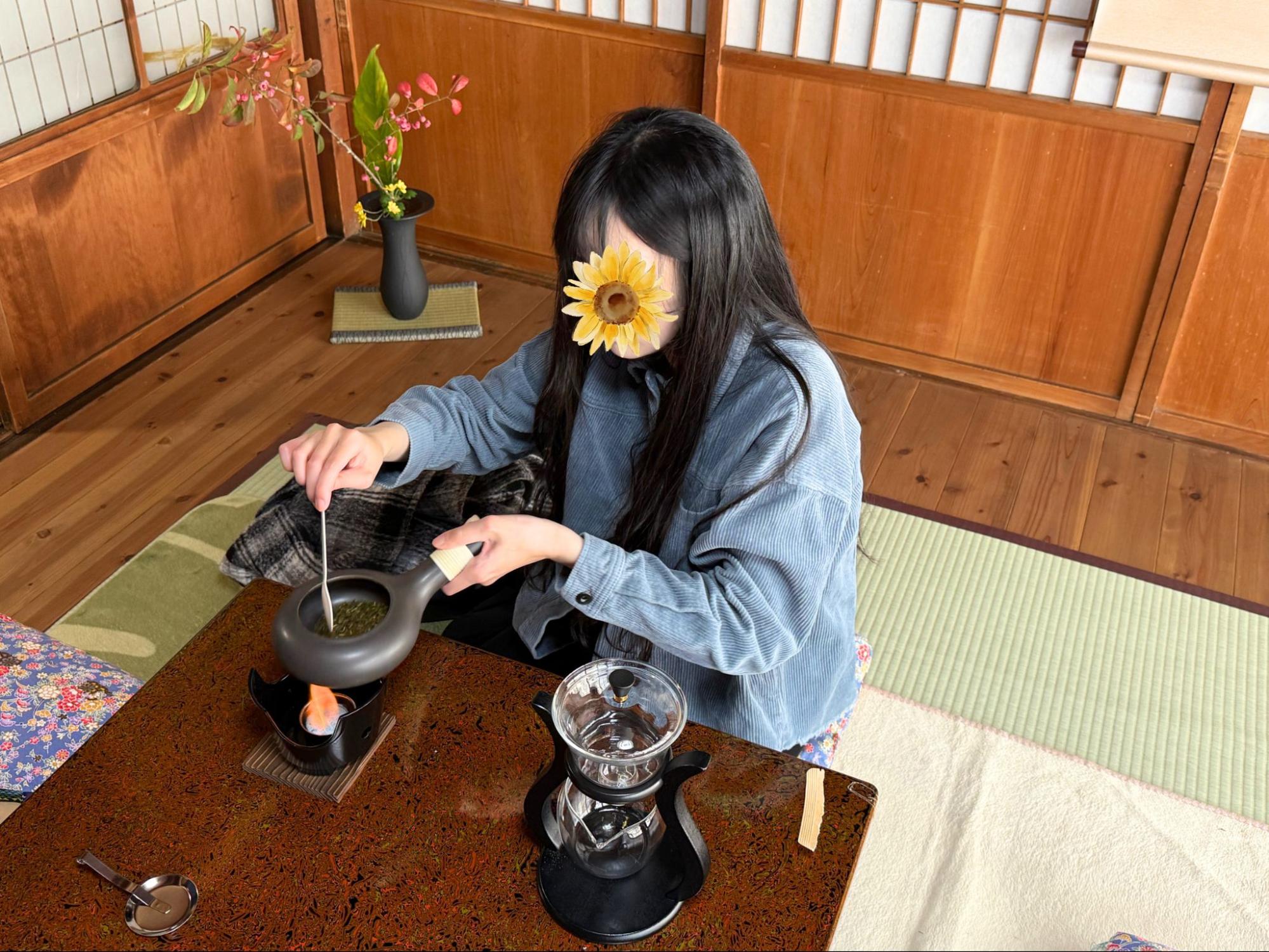 導覽途中,進入一座古民家,當地人熱情地邀請我體驗手沖烘焙茶,並親切地為我說明,使用的是「金飛驒茶」。