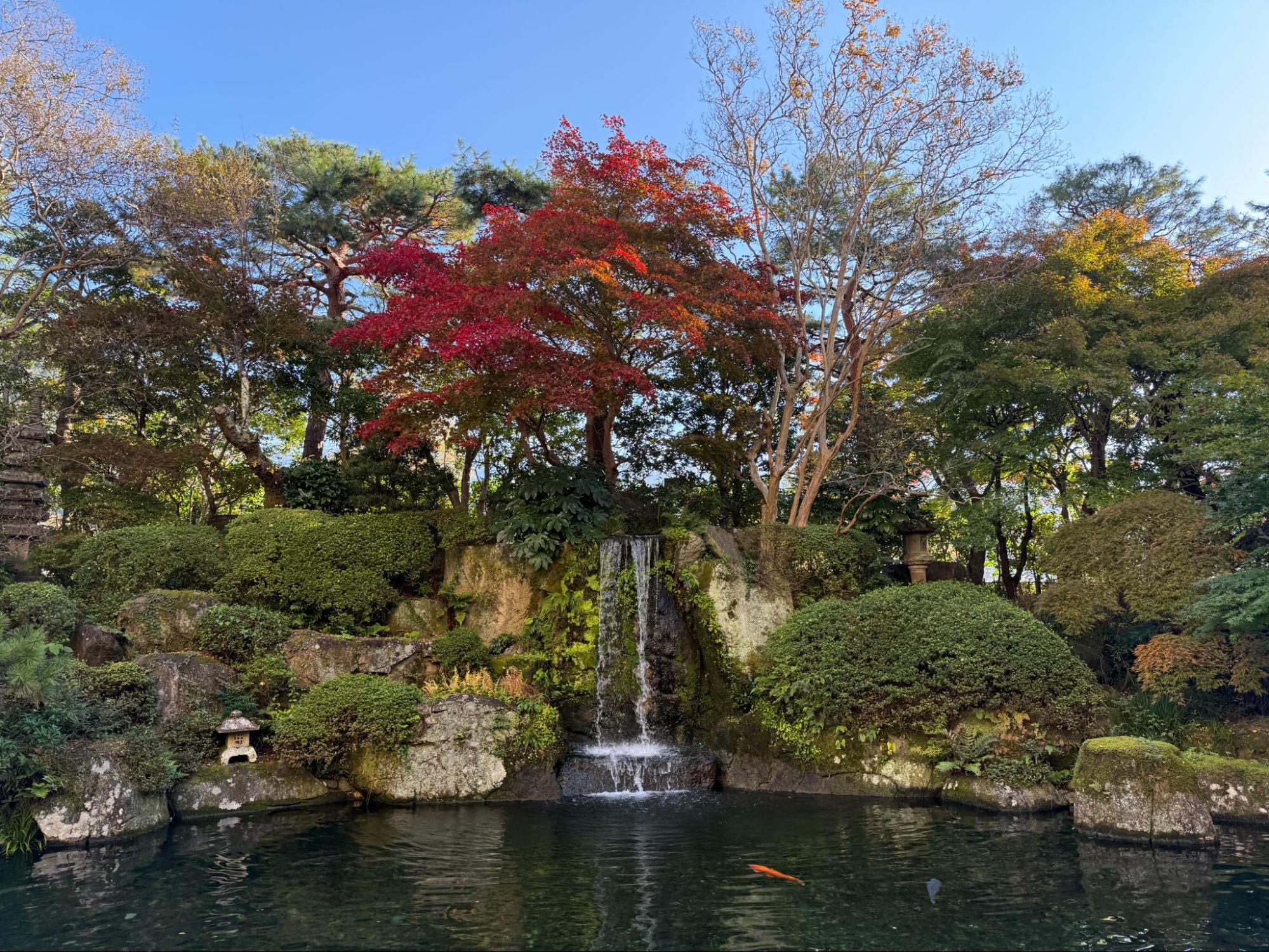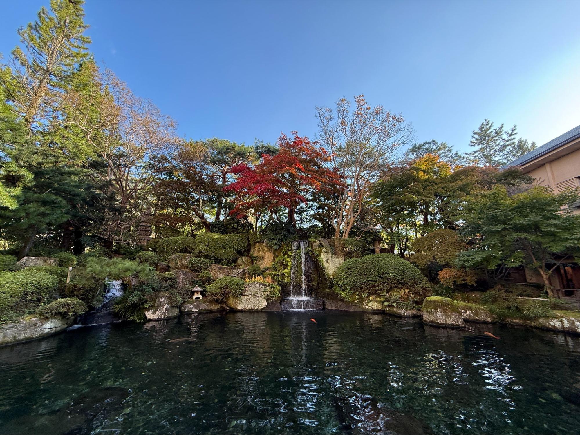 用完早餐後,走到大廳外的庭園散步。此時正值楓紅季節,庭園染上濃淡不同的紅與橙,池水映著晨光,還有鴨子悠閒地游來游去。水明館以溫泉與山水包容旅人,也以日常的細節款待旅人。