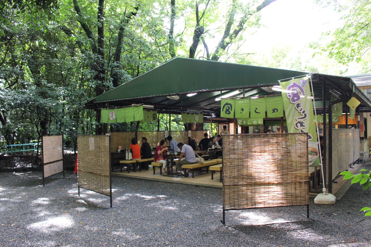 來到神宮,請記得來嚐嚐境內的一間麵店,吃熱田神宮的名物「宮きしめん」。「きしめん」是一種寬版的薄麵,算是名古屋起源的特產,麵條特別彈牙,比我想像中得更好吃。不過湯有點鹹,所以當沾麵吃,小喝兩口最恰當。另外也可以加天婦羅等配菜。