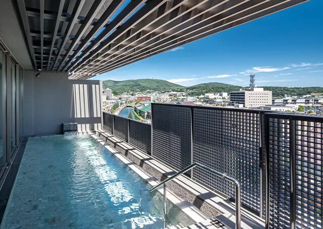 位於頂樓的景觀露天溫泉與三溫暖!能一覽石狩灣,全方位感受小樽的開闊風景。