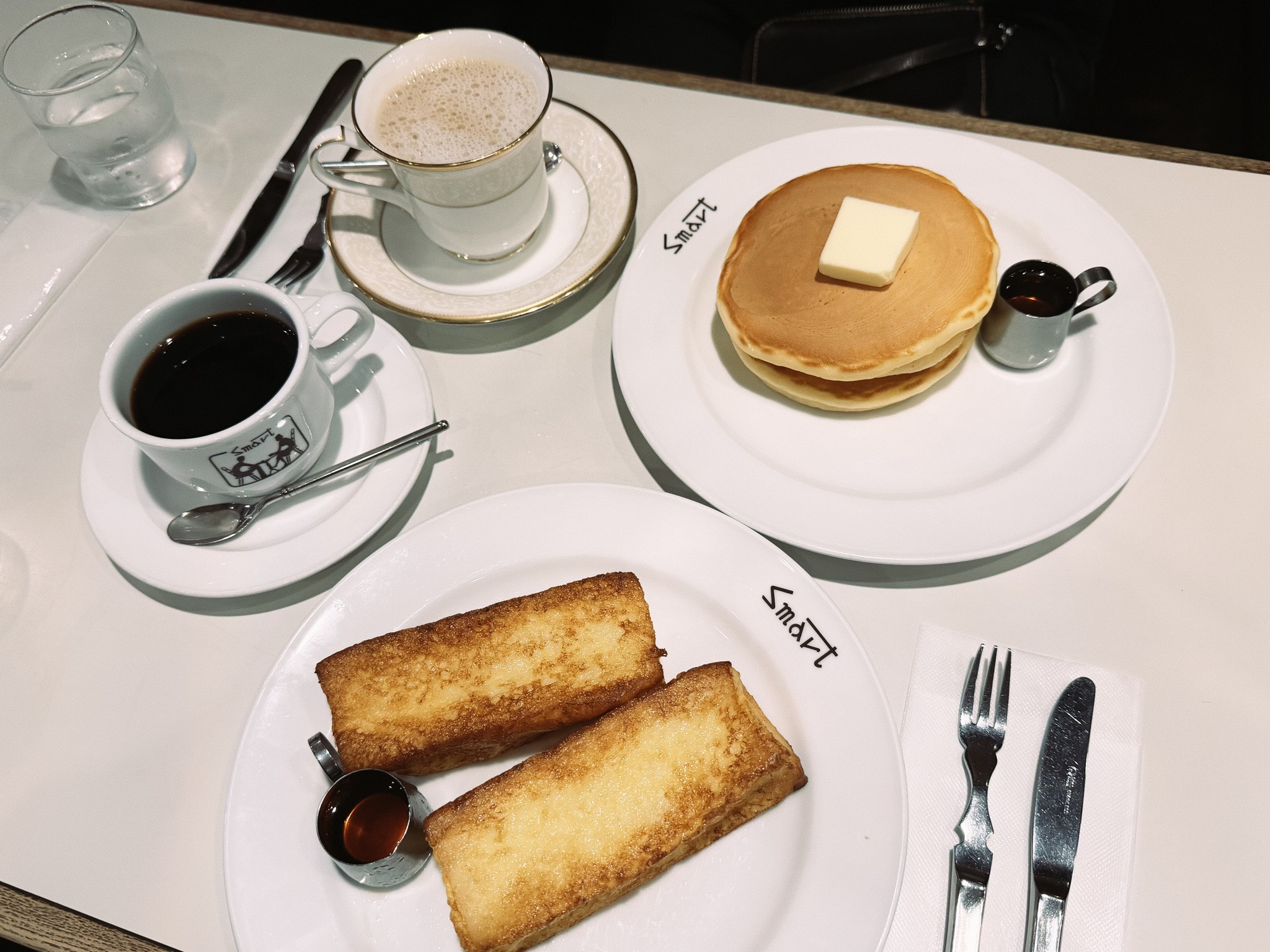 這裡最具代表性的招牌,是熱騰騰的鬆餅與法式吐司,還有老派喫茶店風味的布丁,每一樣我都喜歡。不過,這次是來吃早餐的,布丁於是就先跳過,點了鬆餅和吐司來吃。鬆餅口感厚實鬆軟,表面微微上色,搭配奶油與糖漿,簡單不膩;法式吐司則吸飽蛋液與牛奶,煎至外層金黃、內裡濕潤柔軟,帶著溫和的甜香,十分耐吃。