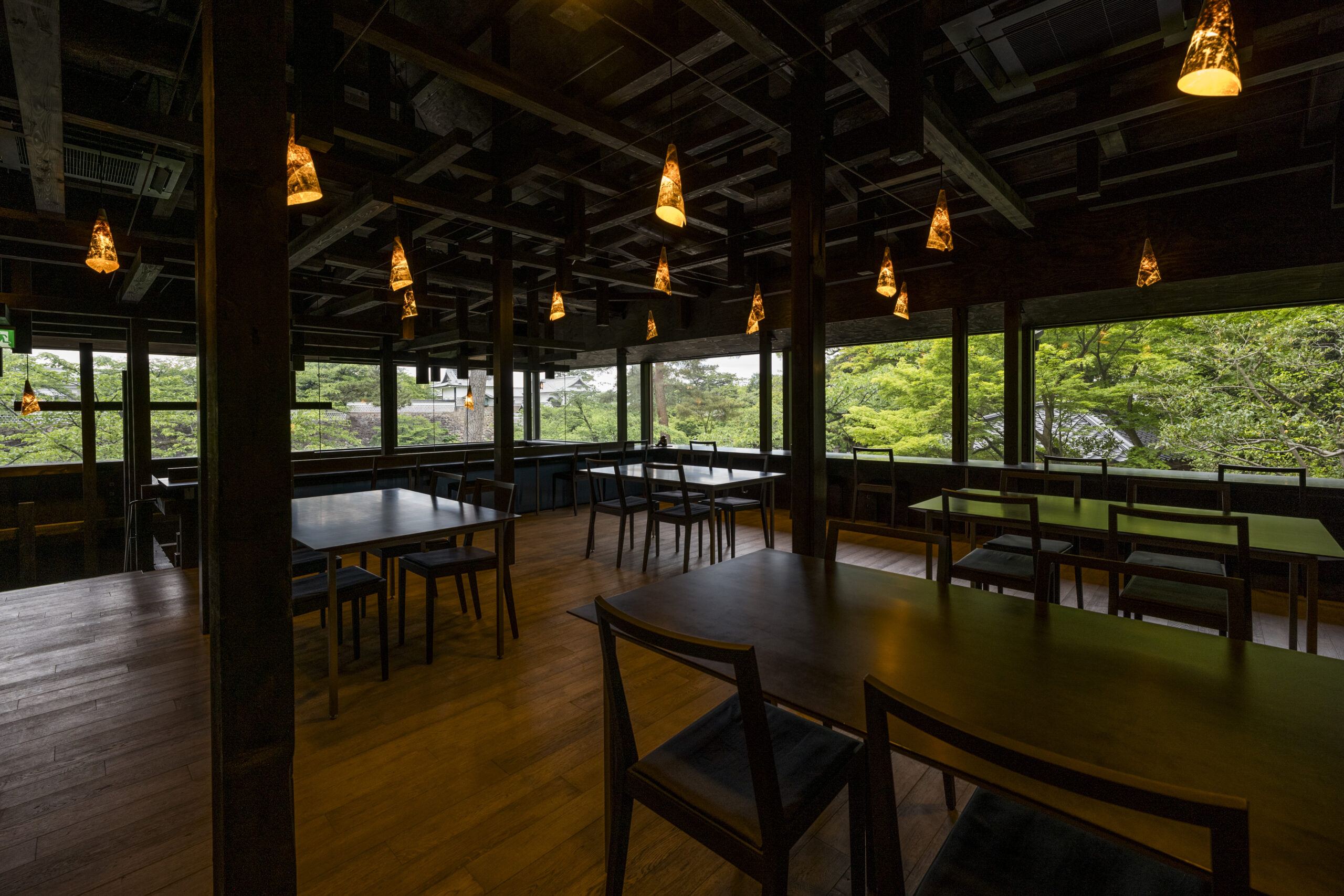 以黑色為基調的空間設計,沉穩而洗練,能一邊用餐、一邊感受兼六園特有的奢華地點。透過窗景眺望兼六園隨四季展現不同的景色,在紅葉時節和雪景時尤為優美。