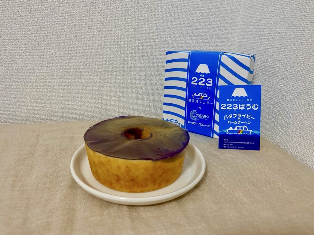 「223 年輪蛋糕(223ばうむ)」是靜岡限定的年輪蛋糕,而且只有在「駿河灣渡輪(駿河湾フェリー)」上才買得到!223 來自日文諧音「富士山(ふじさん)」,而「駿河灣渡輪」是日本僅有公認的海上公路,能欣賞富士山,在包裝與意義上,滿滿濃厚的富士山伴手禮色彩。