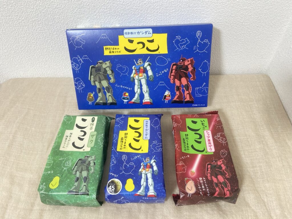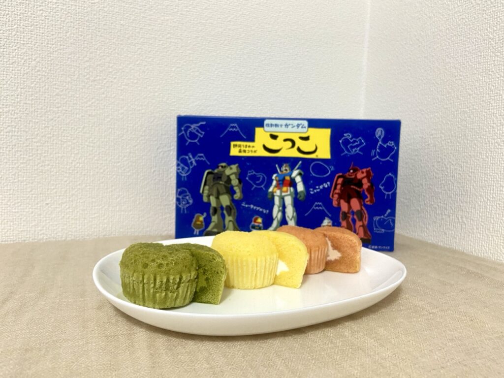 靜岡代表性甜點的「Cocco 小雞蒸蛋糕(静岡こっこ)」,2025 年開始,與誕生 45 周年的《機動戰士鋼彈》展開了最強跨界合作。包裝全面「鋼彈化」的限定聯名禮盒,視覺效果滿分!