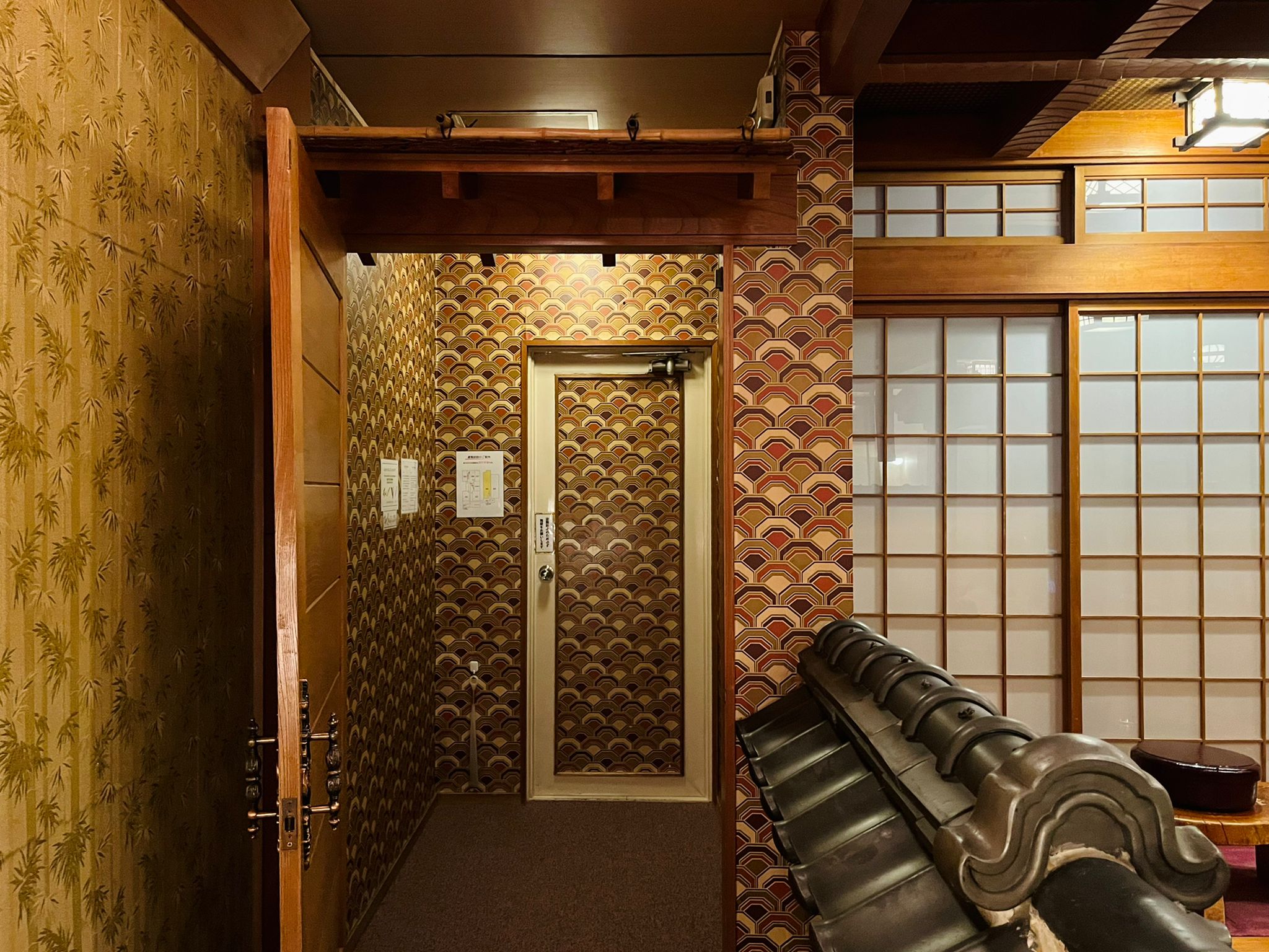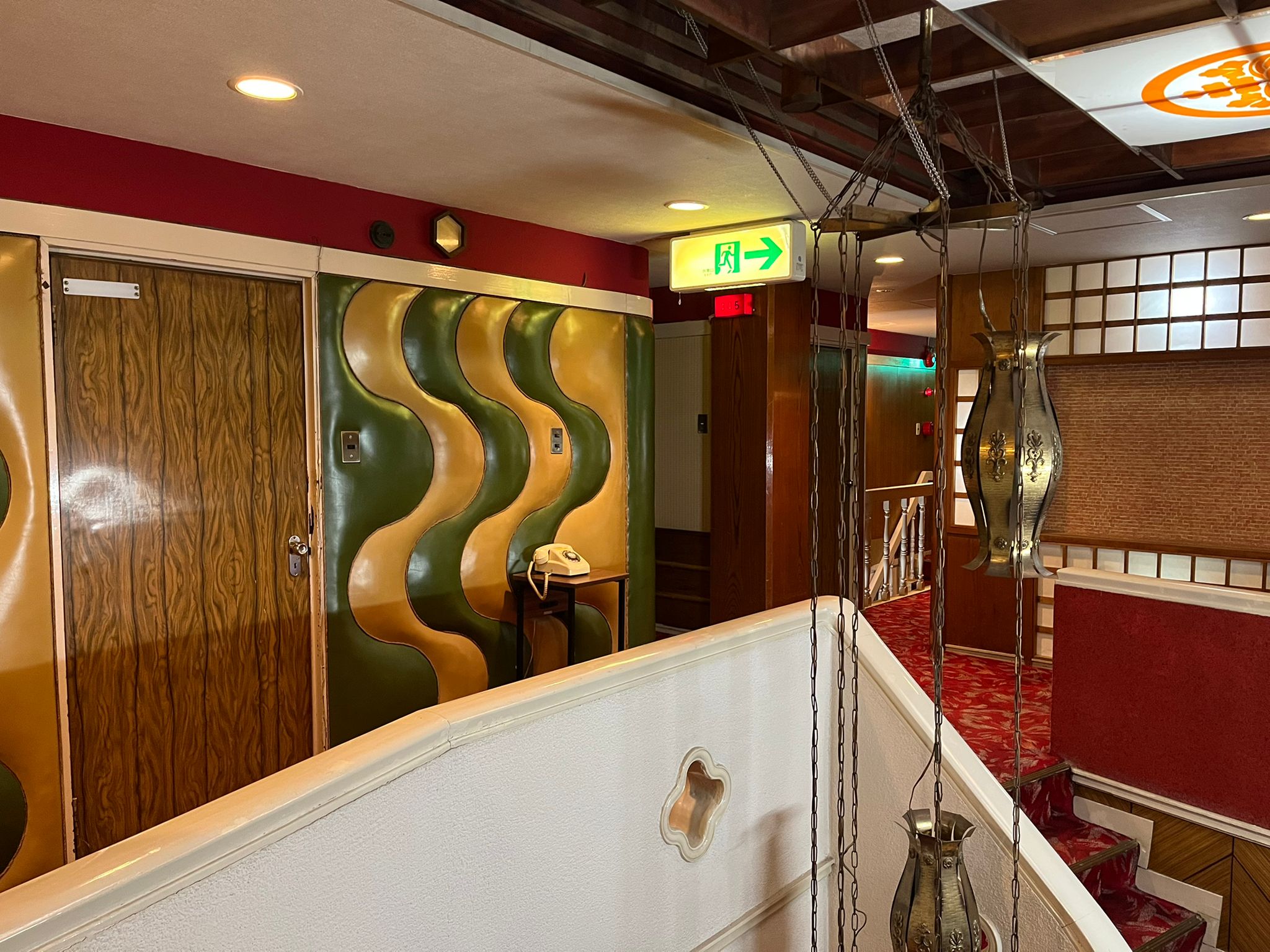 走廊的牆面裝飾展現出不同樓層的變化美學,三樓採用金色與墨綠色相間的波浪紋軟包,每個樓層都配合著不同的顏色配搭的波浪紋設計,牆面上還完整保留昭和時期的米色家居電話,處處流露著懷舊氣息,彷彿讓人穿越回昭和時期的日本。