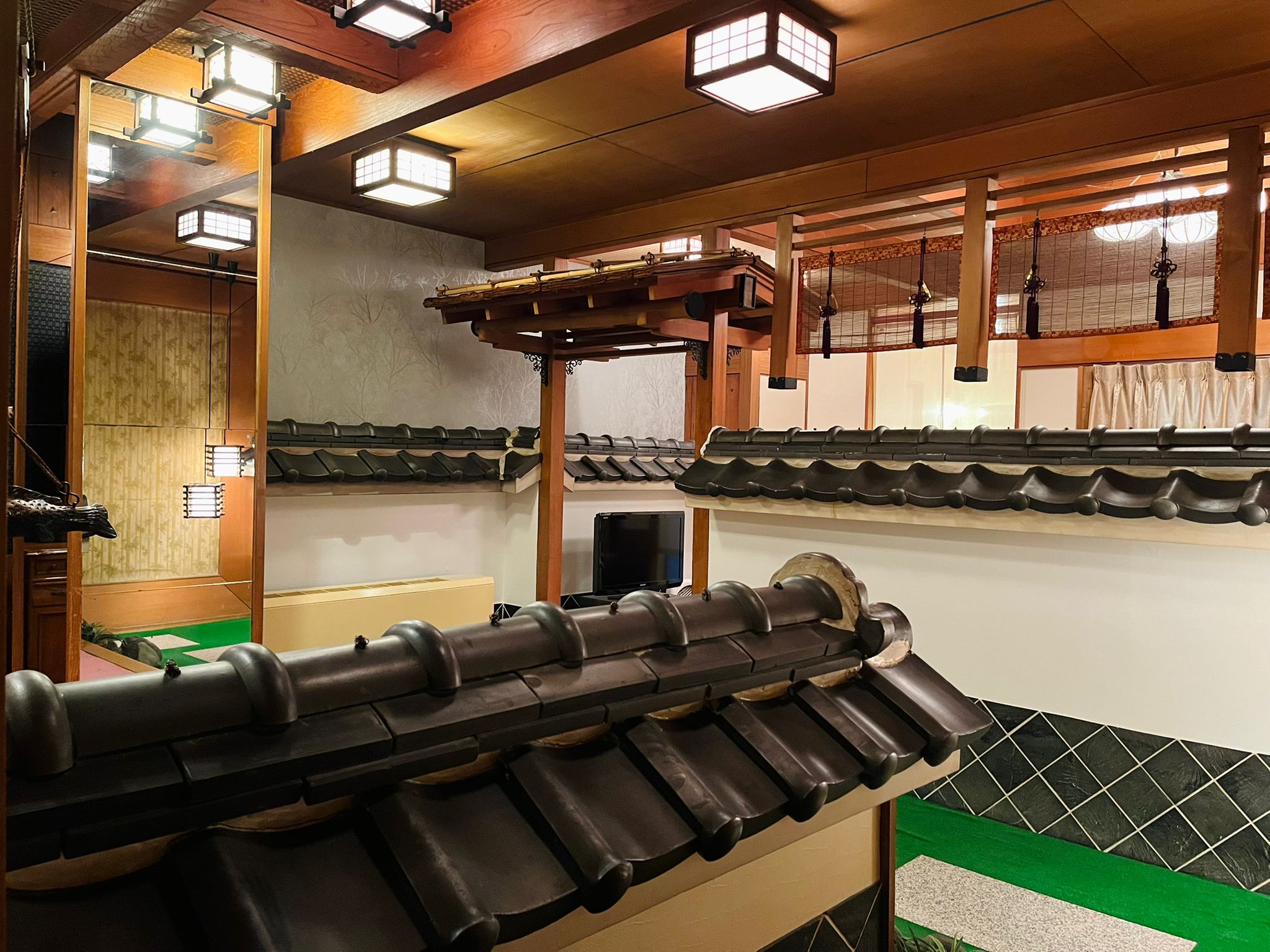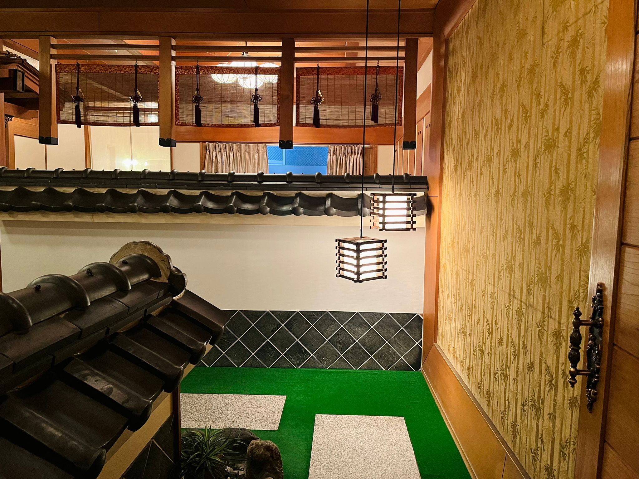 這條室內走廊完美呈現日式建築的精緻美學。天花板懸掛著木格造型的和風燈籠,映照出溫暖柔和的光線。走廊的牆面以竹葉圖案的壁紙裝飾,底部則鋪設了綠色地毯,搭配踏腳石,層次分明。