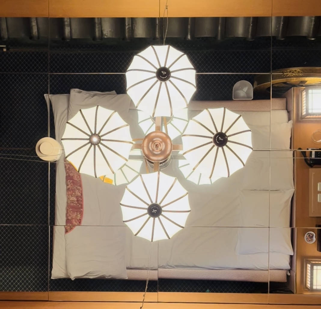 臥室天花板的設計也別具匠心,不僅有整面的鏡面天花板,還採用菊花造型的燈飾組合,白色燈罩配上金屬框架,呈現出情趣旅館獨有的典雅和風美感。