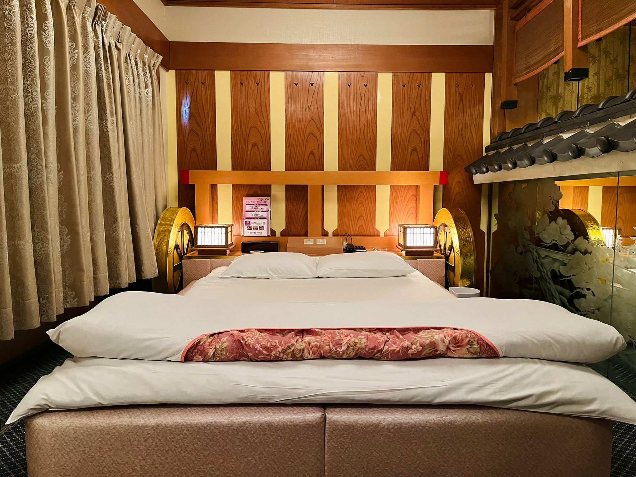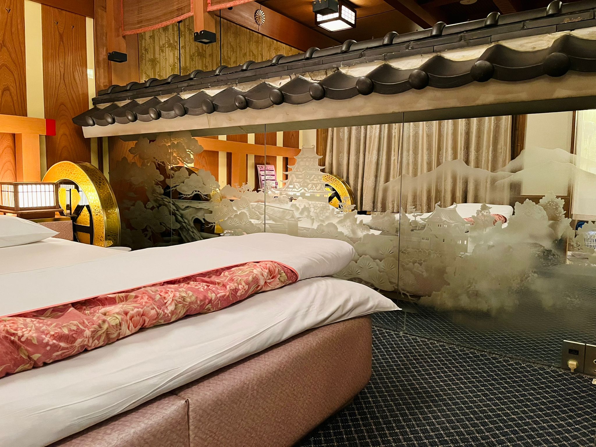 床邊的鏡面蝕刻藝術極具特色,鏡面上描繪著武家屋敷的典雅建築、翠綠山巒、樹木與花卉,在燈光照射下宛如一幅立體的水墨畫卷。如此精緻的藝術品竟出現在情趣旅館中,令人不禁讚嘆店家的用心。