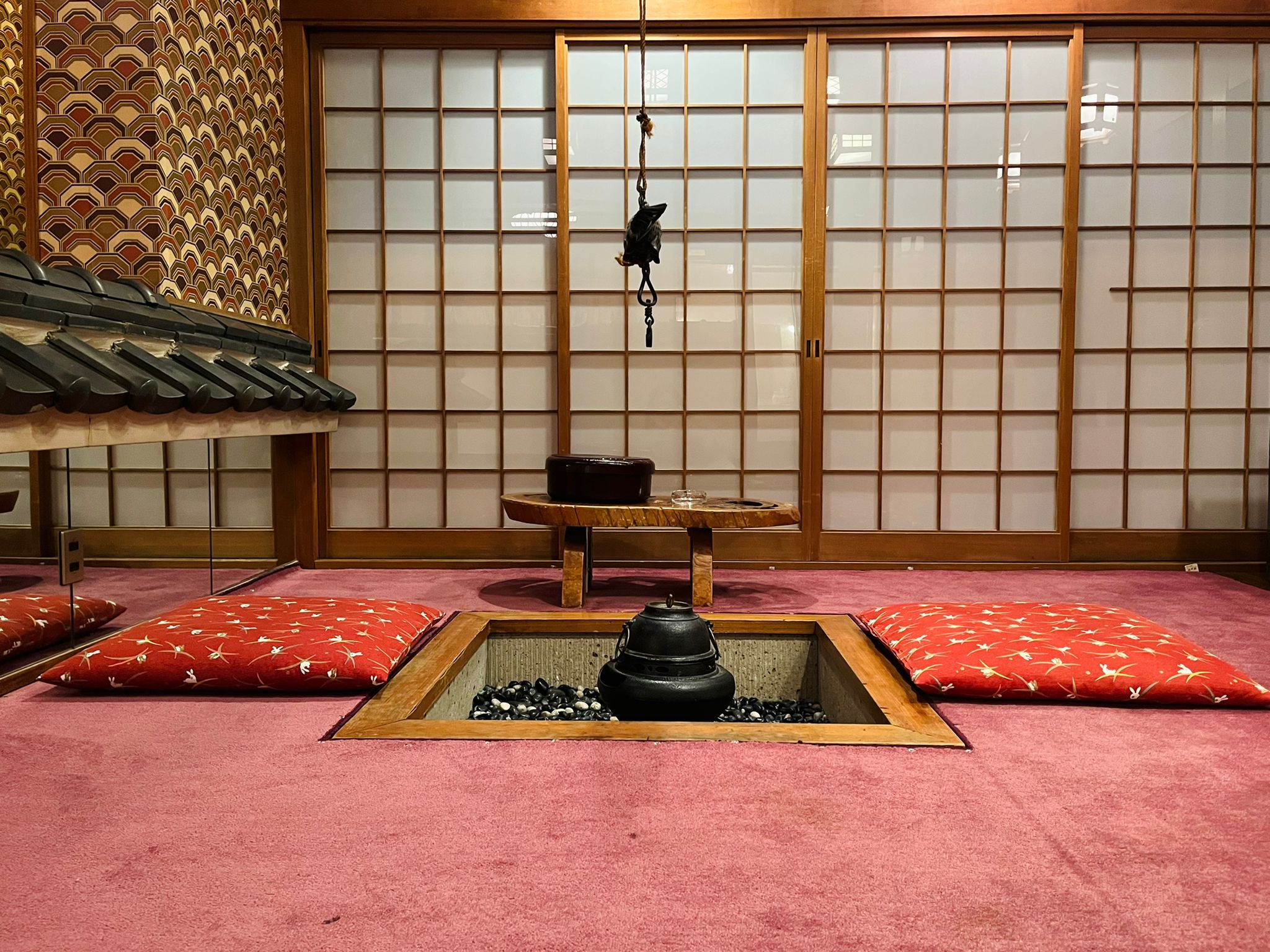 最引人注目的是傳統的「日式火爐(囲炉裏)」空間,紅色地毯和舒適的坐墊圍繞著中央的火爐,上方懸掛著精巧的鐵製「活動吊鉤(自在鉤)」。火爐周邊擺放著古樸的木製矮桌,完美重現了武士宅邸中的起居場景。