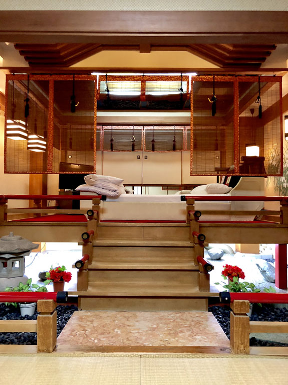 「江戸」主題房型呈現出日式的精緻美學,以日式庭院為設計核心,打造出結合和式臥房與枯山水庭園的獨特空間。房間採用階梯式的設計,將臥床區域架高,下方則佈置了完整的日式庭園造景,包括石燈籠、碎石地及盆栽等元素。天花板懸掛著典雅的竹簾,搭配紅色格柵造型的裝飾,營造出濃厚的江戶時代氛圍。