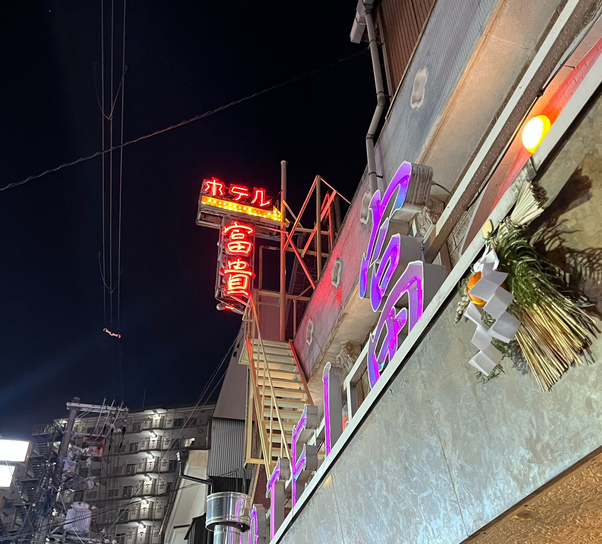 到達京橋時正是夜幕低垂,京橋街角裡一座紅色霓虹招牌,「HOTEL富貴」的字樣在暗夜中清晰可見。這面霓虹帶著地道昭和氣質,在夜色中恰到好處地點亮街景。等到天色完全暗下,紅色霓虹與藍紫色的側招,在牆面上勾勒出鮮明的輪廓,這座承載昭和記憶的建築靜靜佇立在街角,吸引著路過行人的目光。不少攝影愛好者會在這裡停下腳步,捕捉這難得一見的時代風景。