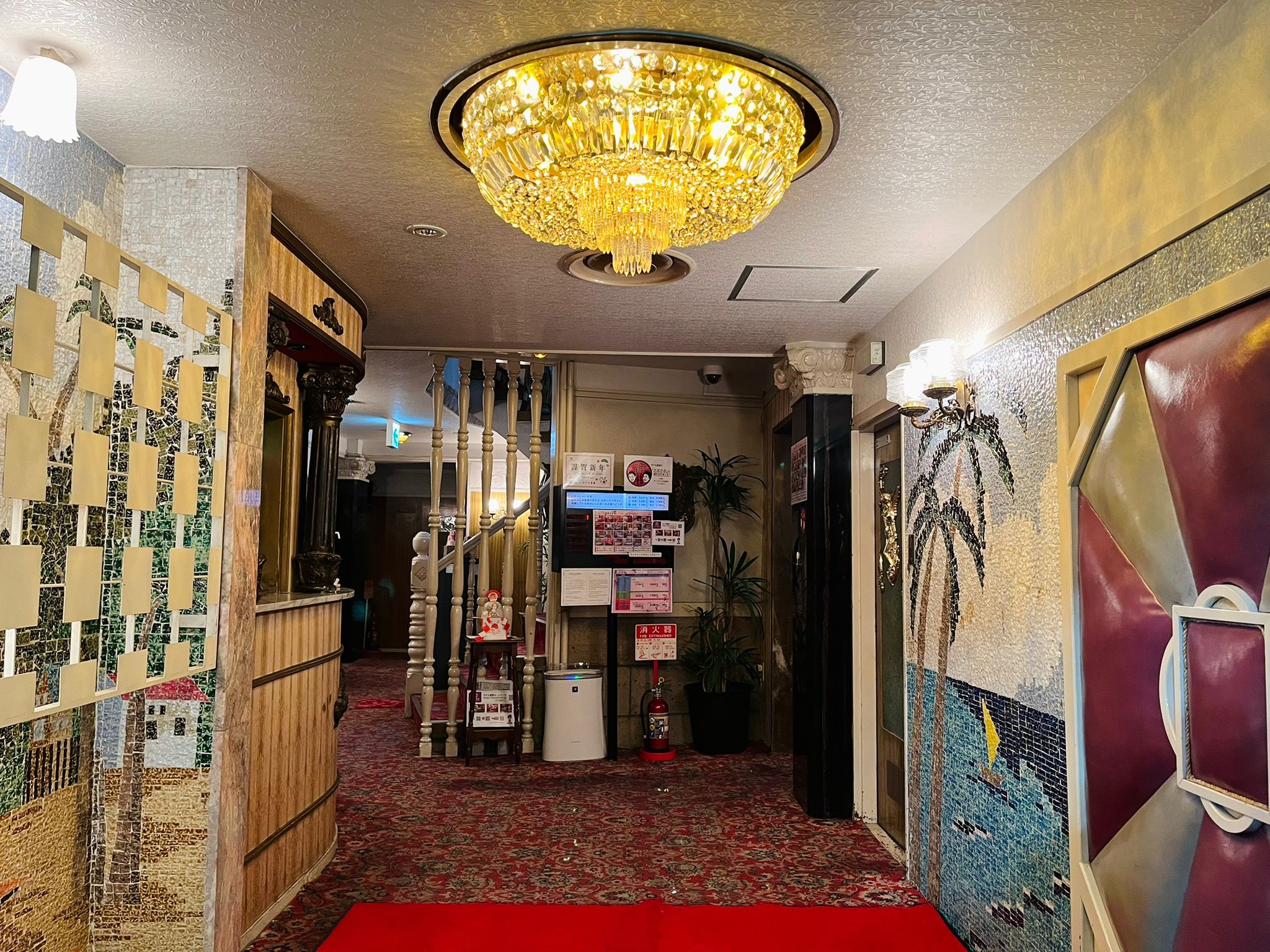 入口大廳:馬賽克牆面與水晶燈飾