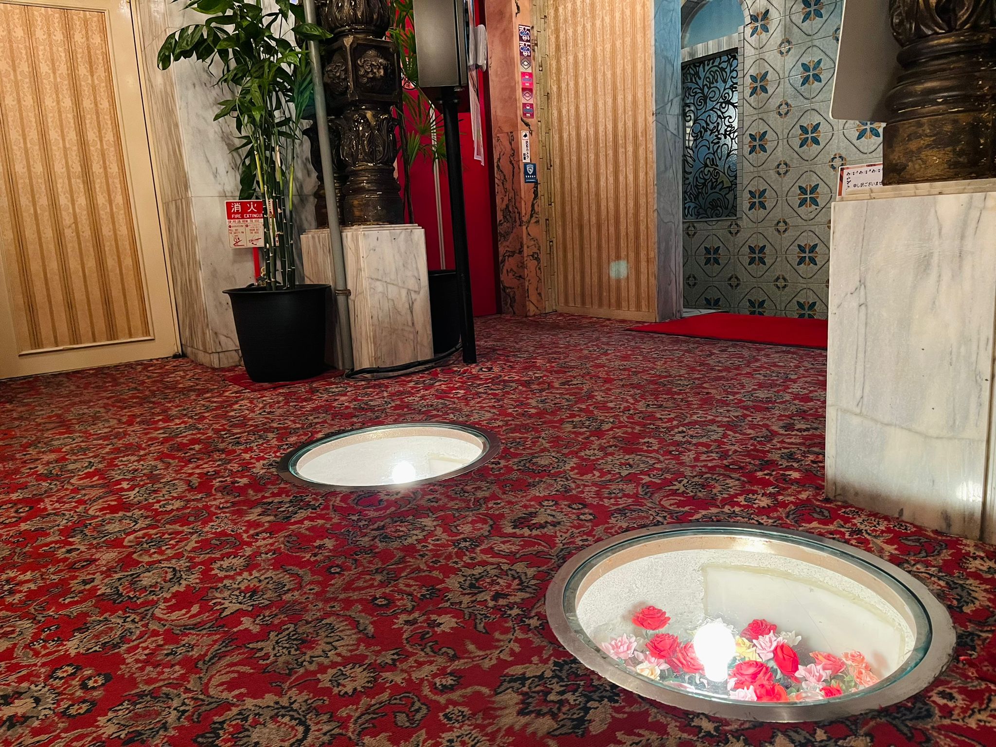 一樓電梯前的空間展現出細膩的設計巧思,紅色花紋地毯上嵌入兩個圓形玻璃展示窗,裡面擺放著粉紅與紅色玫瑰花,在燈光照射下閃耀著柔和的光芒,可見昭和時期的精緻設計。
