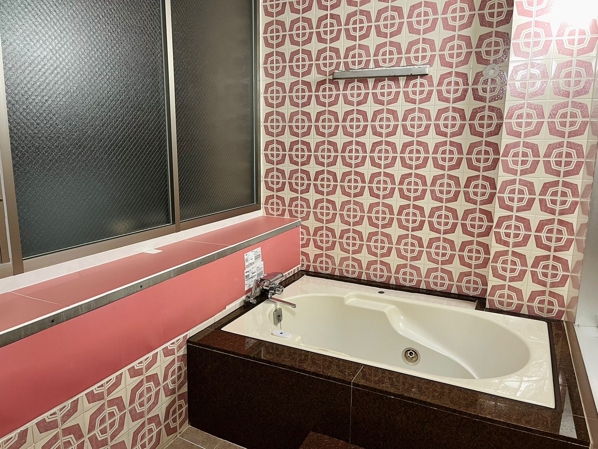 浴室空間融入昭和時期的設計風格,以粉紅色和純白為基調,牆面鋪設著幾何圖案的復古瓷磚,營造出溫暖懷舊的氛圍。雖然設備帶有年代感,但保養得宜,處處展現出當年精心打造的細節,為沐浴時光增添幾分優雅情調。