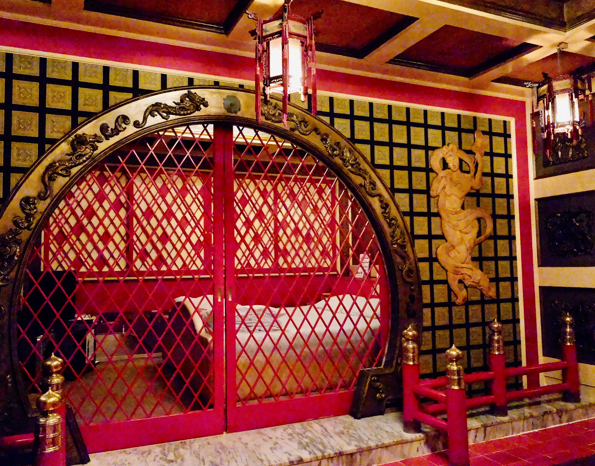 「中華」主題套房以氣派的圓形拱門作為空間主軸,金色雕花框架搭配紅色菱格花門,展現出濃厚的東方美學。牆面採用綠色方格與金色框線的設計,天花板的華麗水晶吊燈與古典宮燈相互輝映。大理石門檻與紅色地磚的搭配,營造出奢華內斂的宮廷氛圍。整體空間充滿細節巧思,從雕刻壁飾到傢具擺設,處處展現出精緻的中國古典風情。
