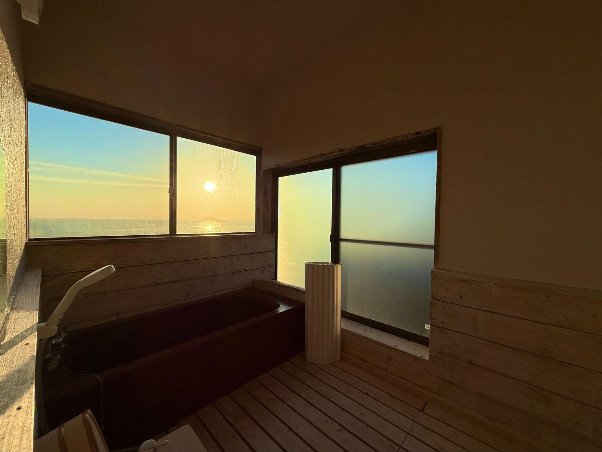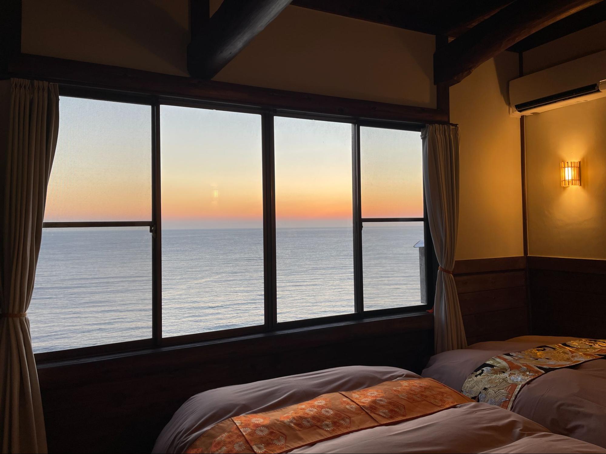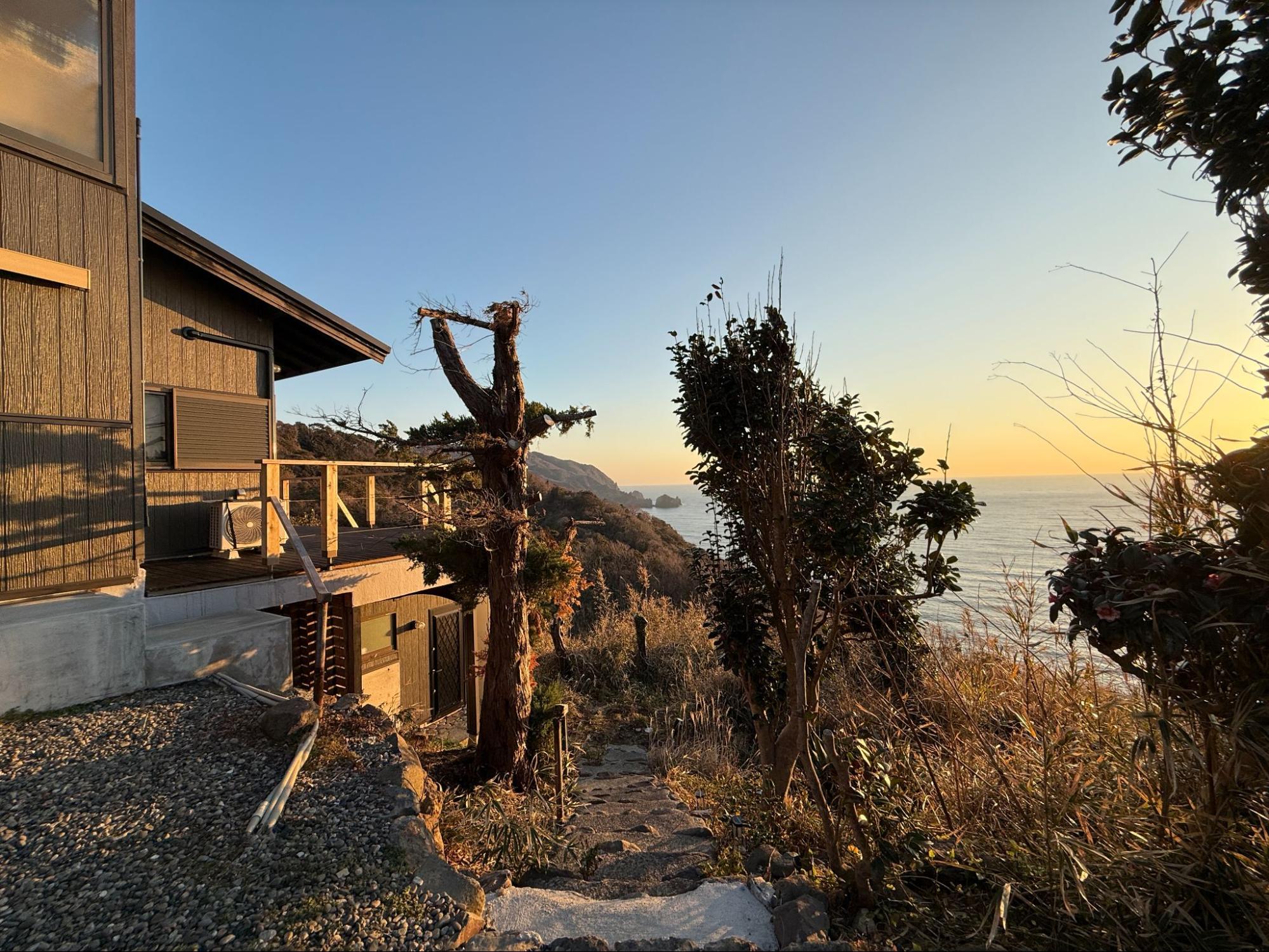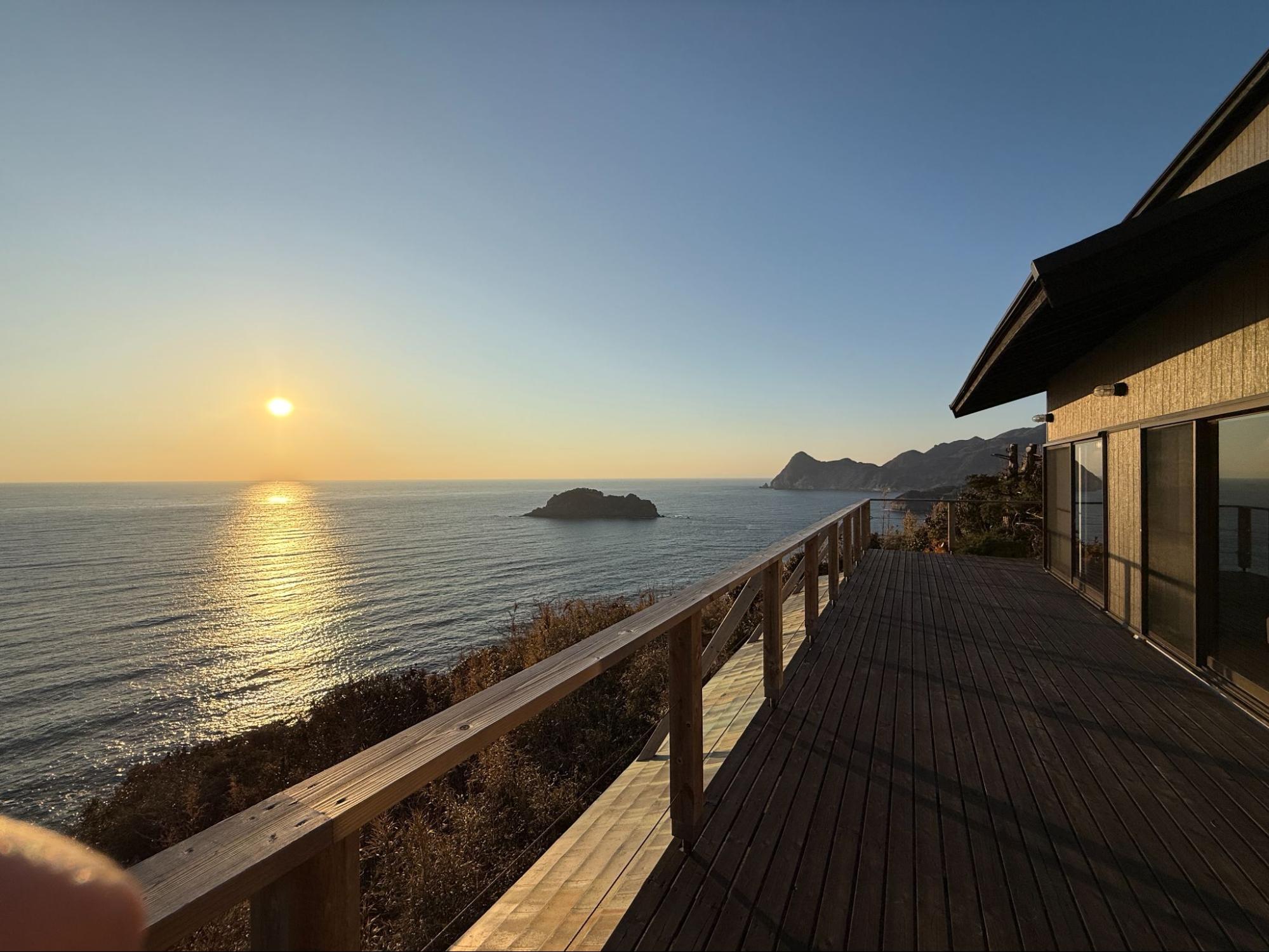 當陽光完全升起,整棟木造 Villa 被照亮,海與天空再次成為主角。這一夜的海景,從黃昏到星空,再到晨光,完整留在記憶裡。