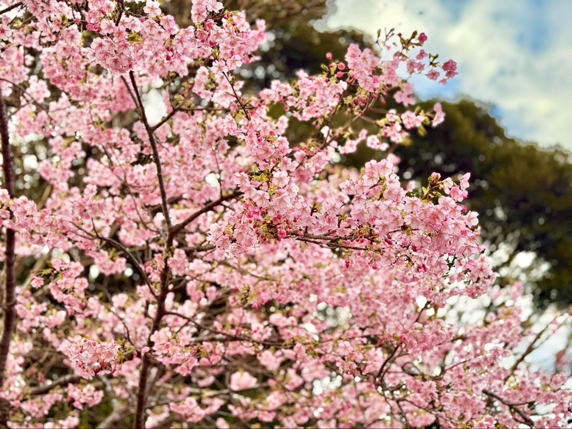 這段路程一路可見早春盛開的河津櫻,粉嫩的花色與三、四月常見的櫻花不同,顏色更深、更飽和。粉紅色在山坡與道路兩旁點綴,與遠方的藍色海面形成鮮明對比。櫻花並未集中在某一處,而是沿著行程不斷出現,讓整段移動過程也成為浪漫的風景。