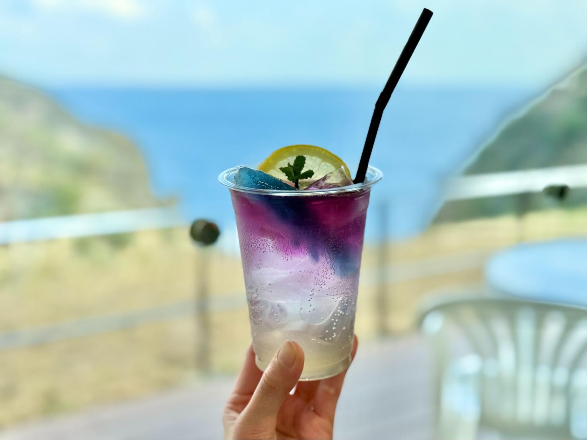 我在這裡簡單用餐,點了一杯漂亮的汽水,冰塊竟是海豚造型,在玻璃杯中輕輕晃動,和眼前的海景相互呼應。