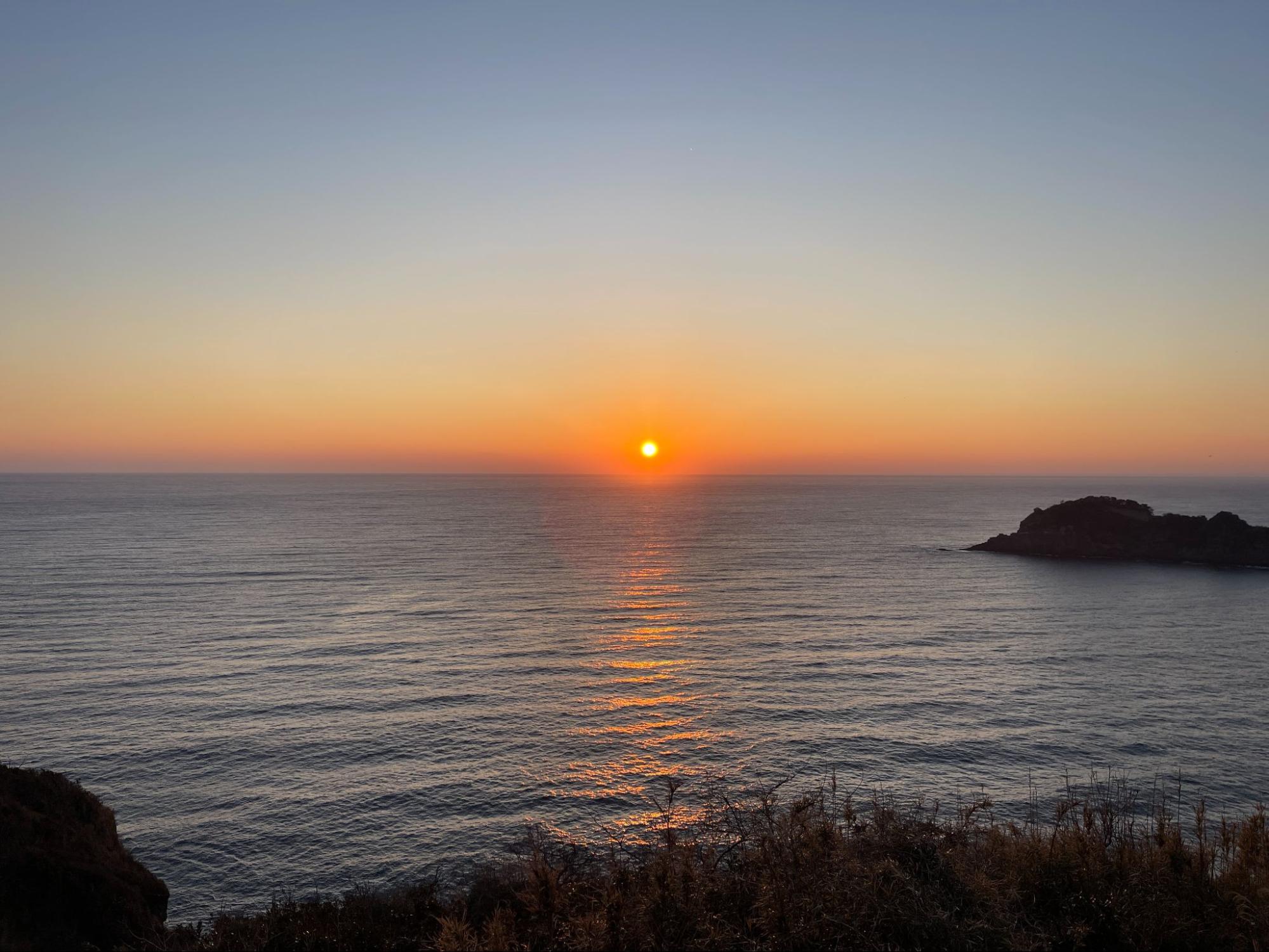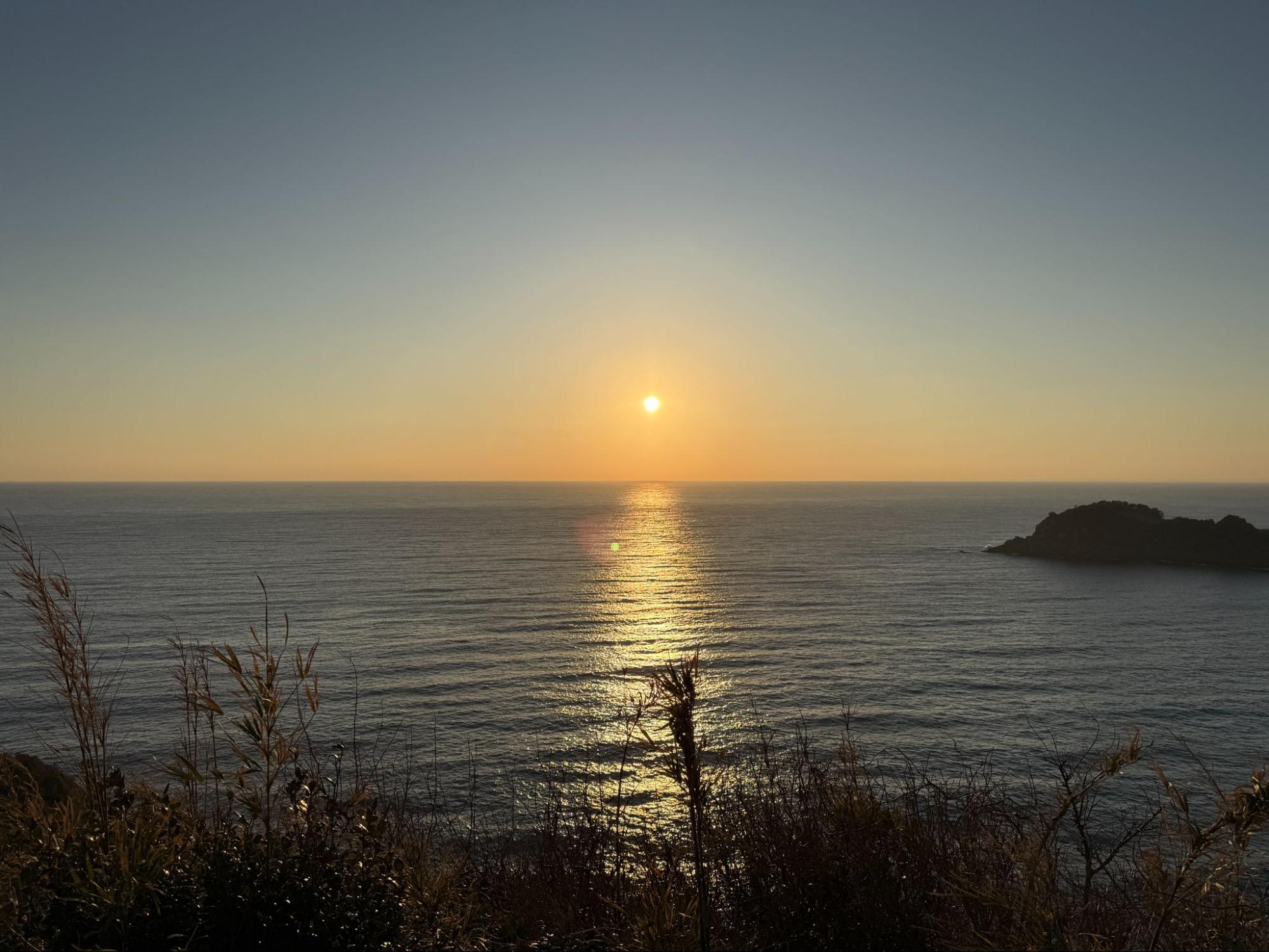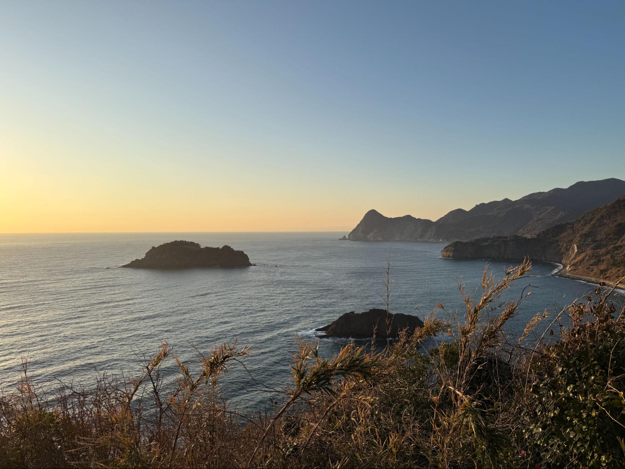 昨晚深邃的黑色海面,此刻轉為清澈的海藍色。小宇留居島與宇留井島在晨光中重新顯現輪廓,天空則帶著淡淡的銀白與淺藍。陽光尚未強烈,整片景色顯得透明而安靜。