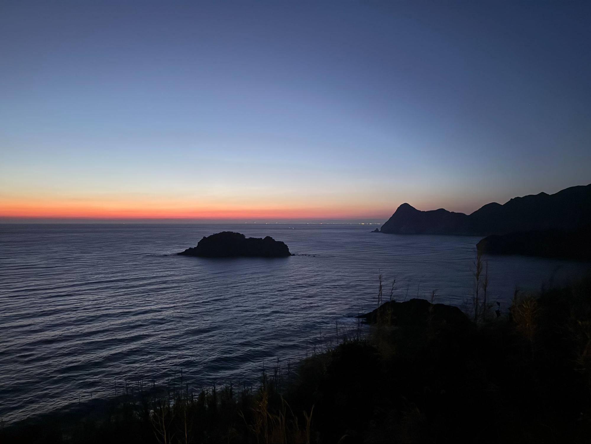 第一顆星出現時,其實不太確定是不是錯覺。再過幾分鐘,第二顆、第三顆星逐漸清晰。隨著光線完全退去,整片天空變得深邃而乾淨。這裡沒有城市燈光的干擾,海面也沒有密集的船隻燈火,視野因此格外純粹。