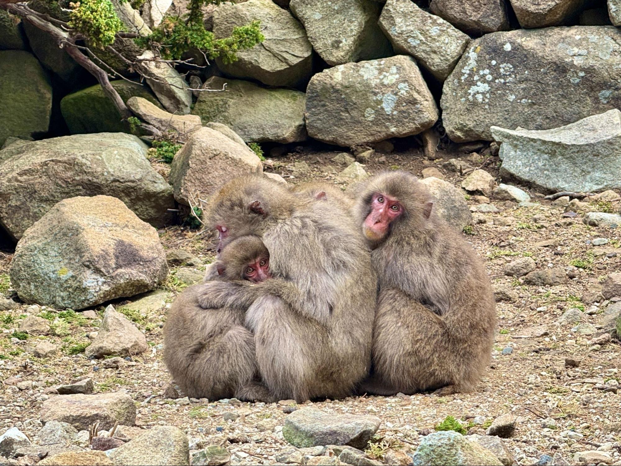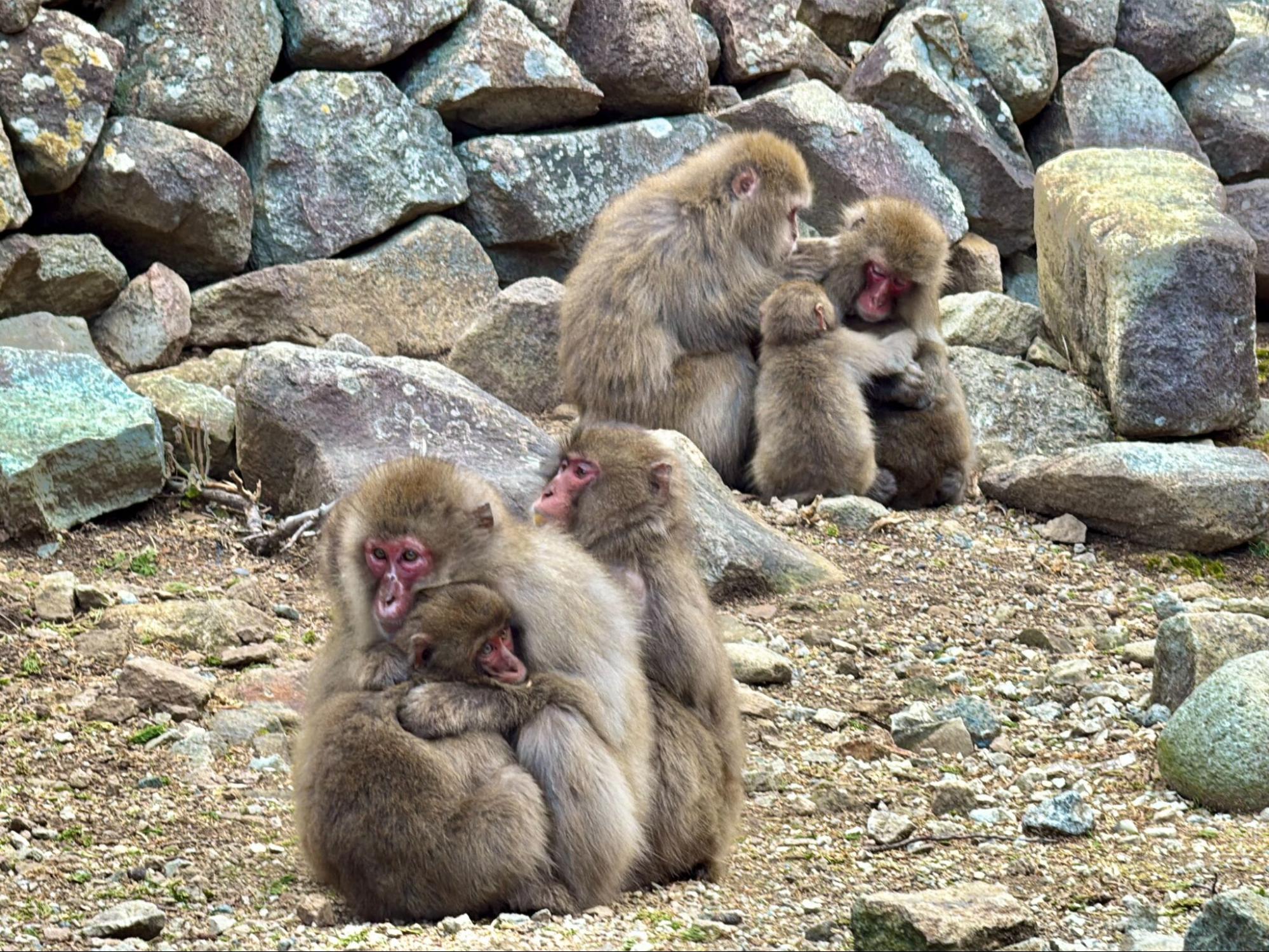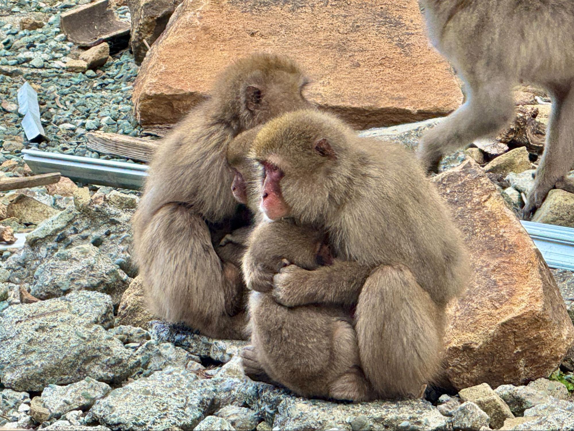 當天風勢不小,氣溫偏低。猴子們緊緊依偎在一起取暖,小猴子蜷縮在母猴懷中,圓滾滾的眼睛不時望向四周。那樣的畫面既溫柔又真實。另一側,年輕的猴子們則在岩石間追逐打鬧,動作靈活迅速,偶爾停下來張望,神情帶著警覺與好奇。