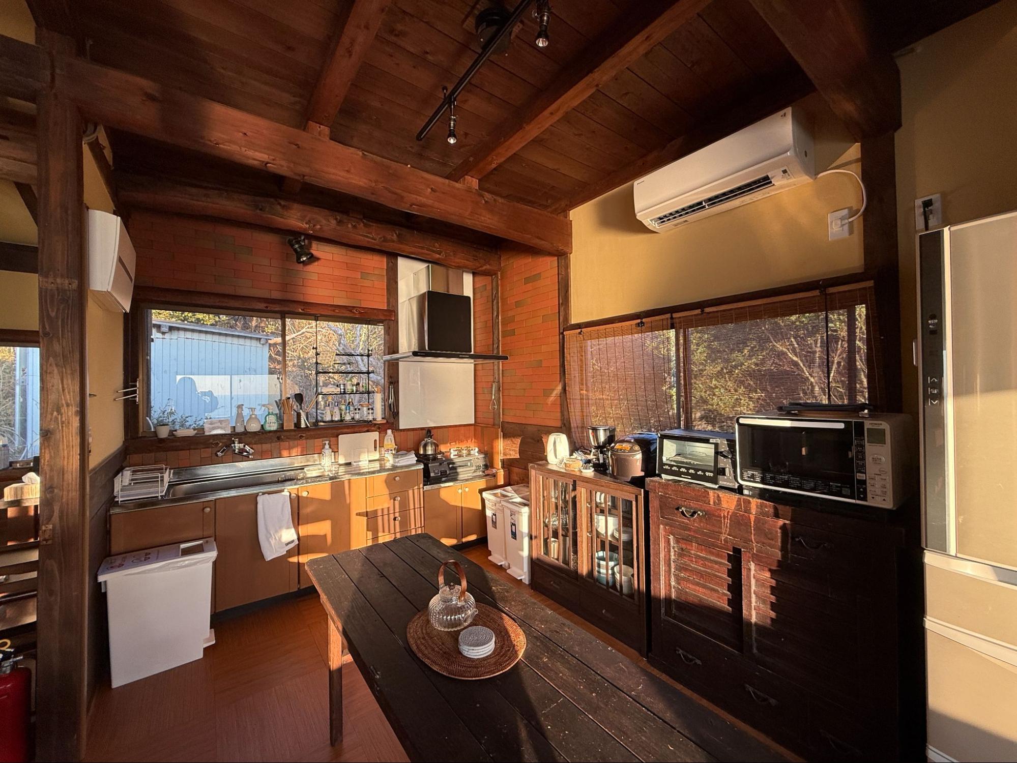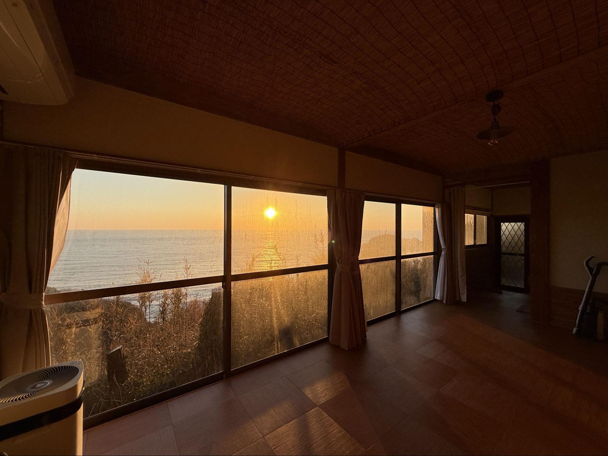 整棟木造建築也在這段時間裡悄悄改變顏色。客廳牆面被夕色染上暖調,樓梯扶手與窗框在橘紅光線下顯得柔和。即使坐在室內,仍能感受到夕陽的存在。