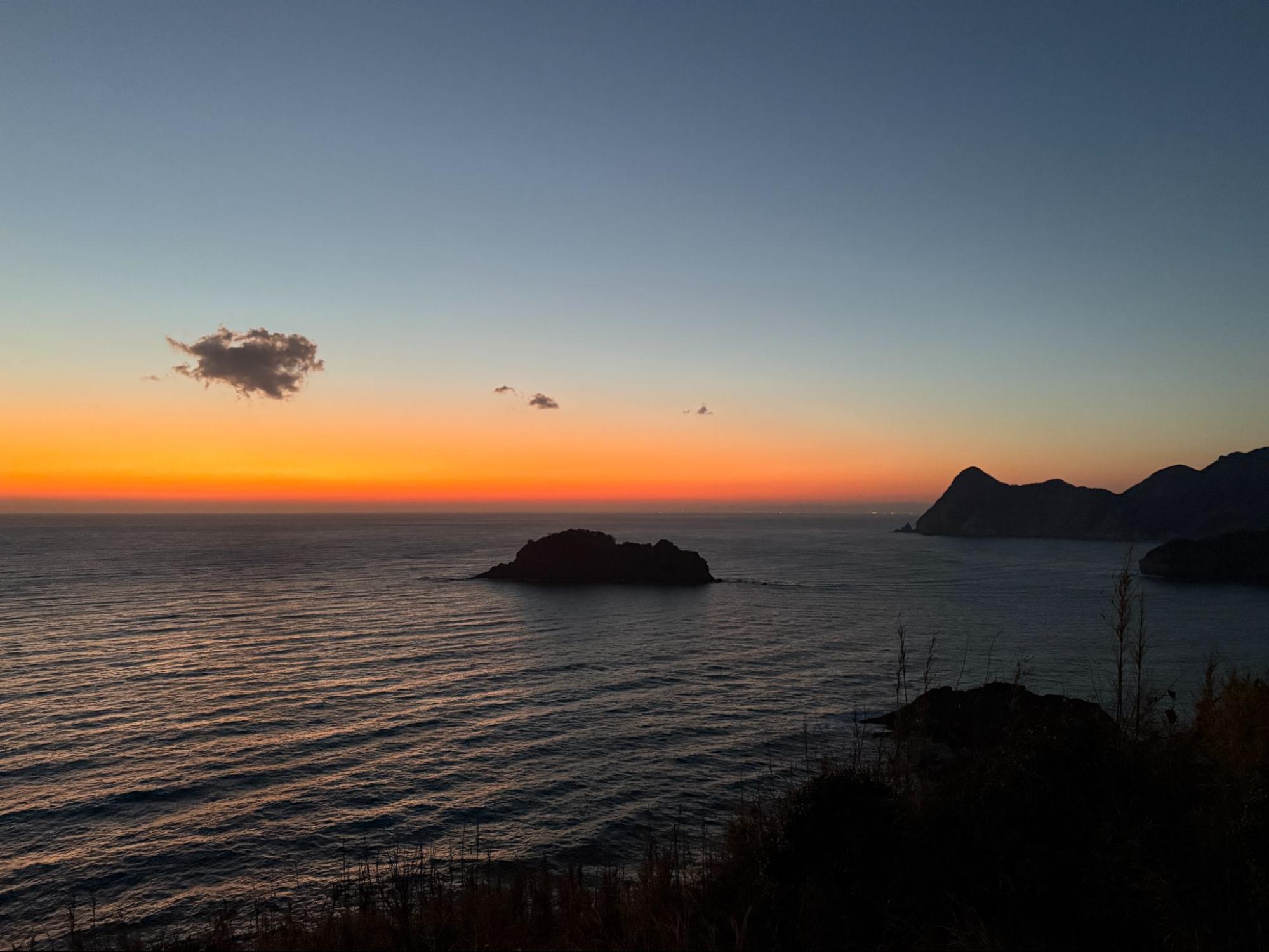夕陽完全沉入海面後,天空並沒有立刻變暗。橘紅色的餘暉在海平線上停留了一段時間,慢慢轉為深紫與靛藍。遠方的小宇留居島與宇留井島此時成為沉靜的黑色剪影,浮在漸暗的海面上。