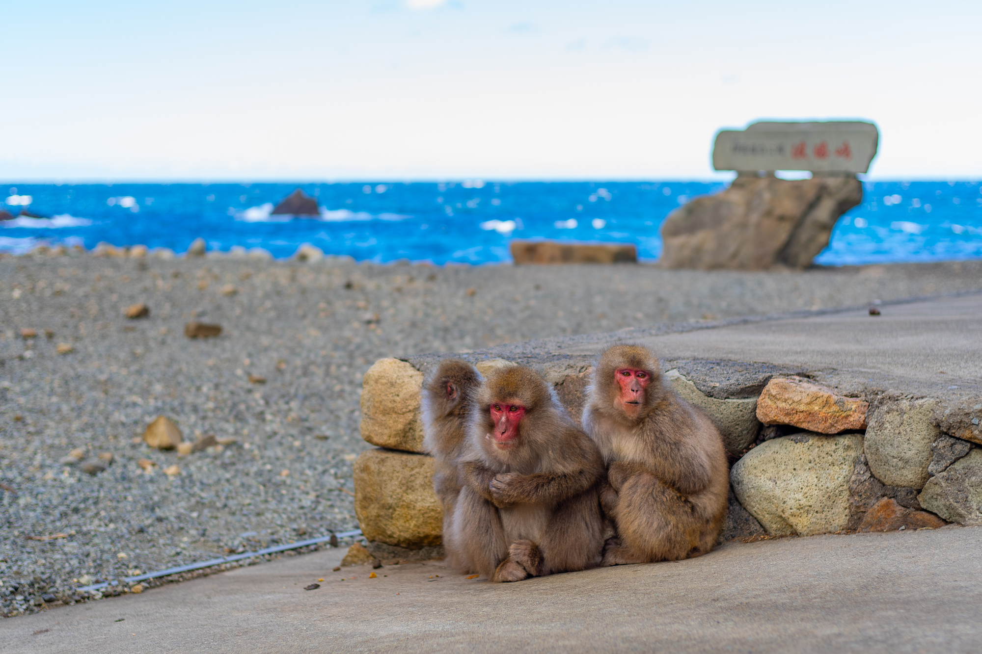 海就在不遠處。強風掠過海面,掀起白色浪花。猴群與大海在同一個畫面裡出現,野生生命與壯闊海景並存。