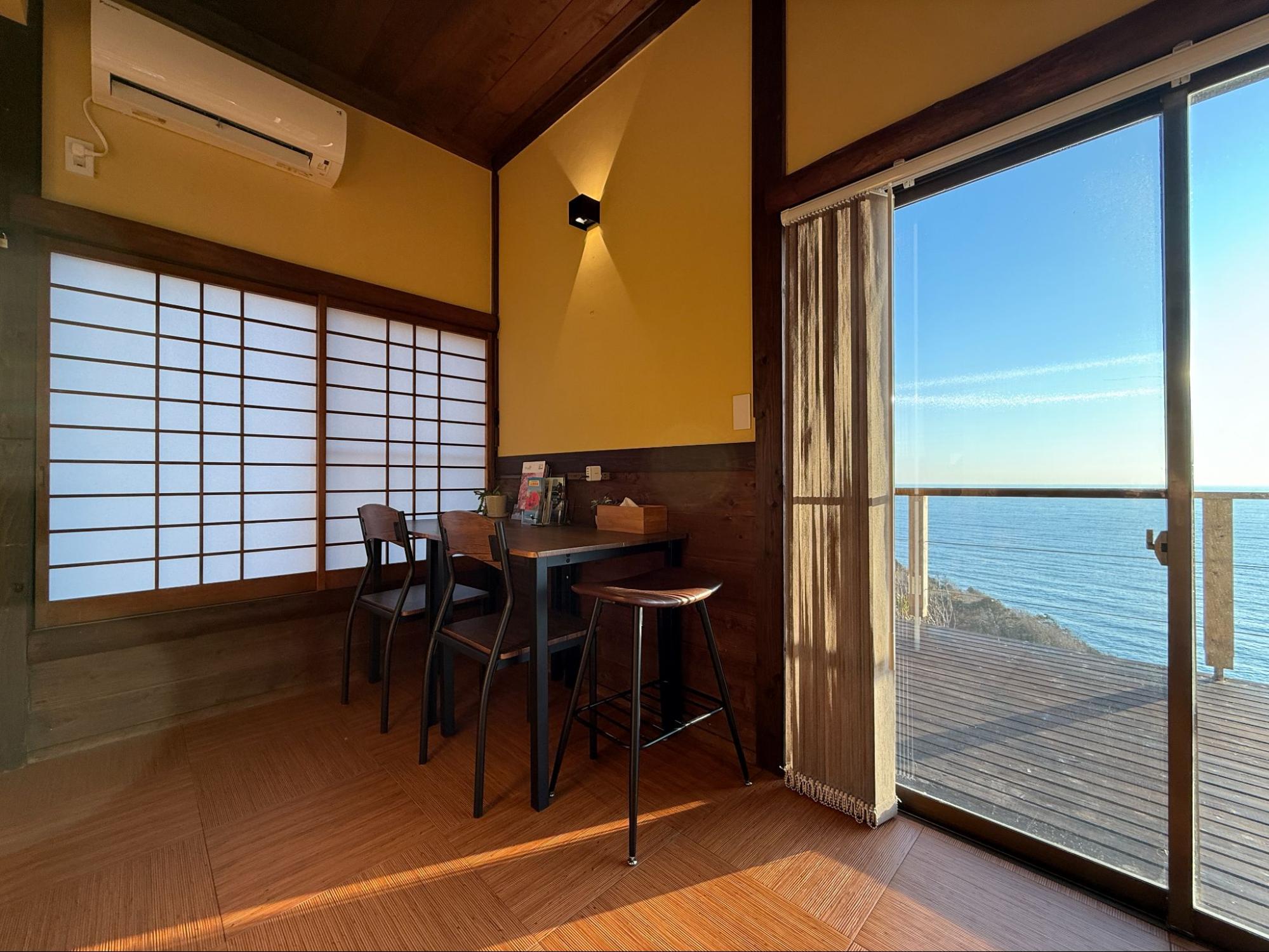 順著地勢往下的和式榻榻米空間,同樣擁有絕景。坐在榻榻米上,海景變得更貼近視線,像是一幅被框住的畫。
