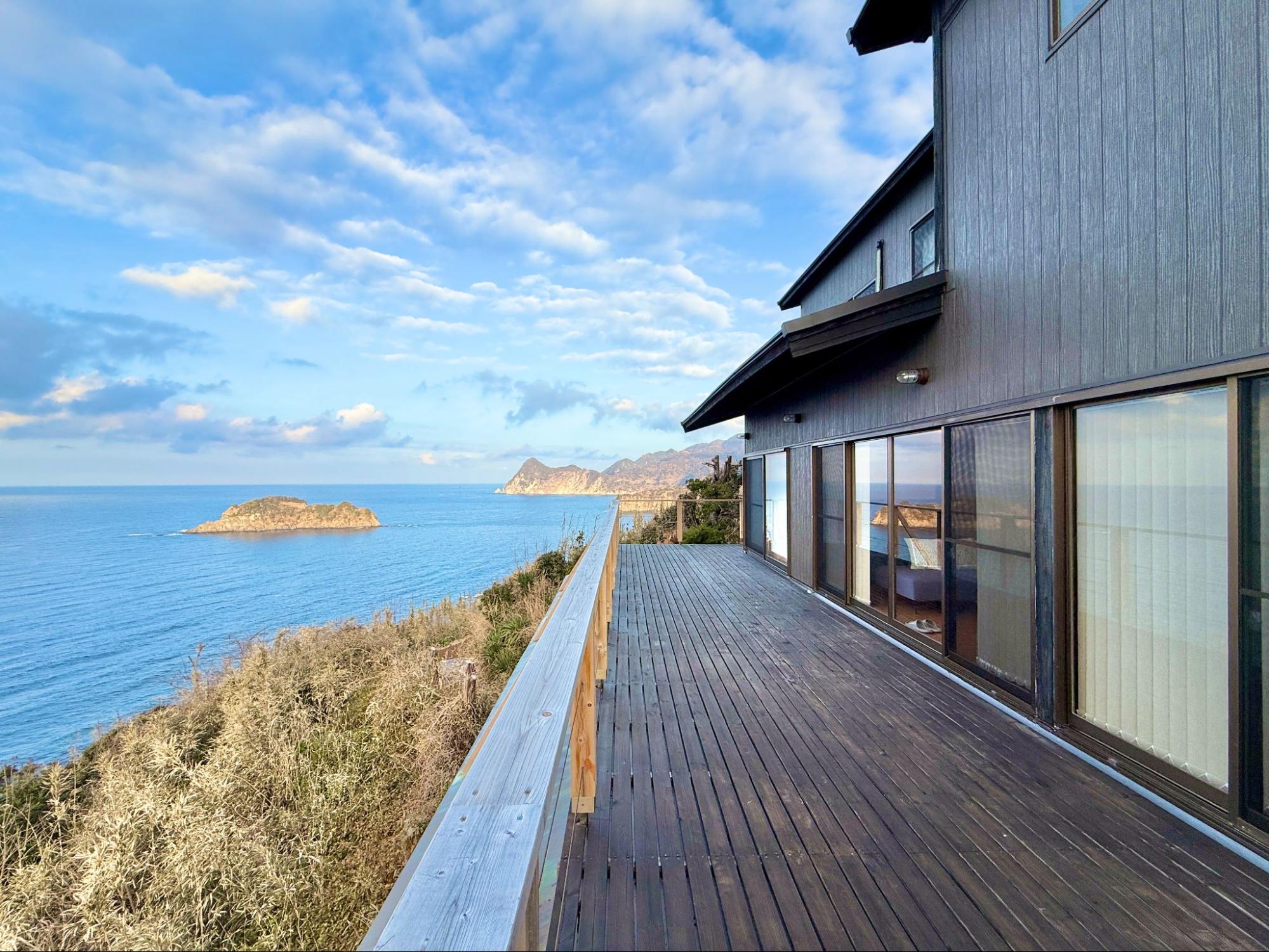 一樓客廳外是寬闊的木質陽台,海與天空在眼前鋪展,完全沒有遮擋。將客廳椅子搬到戶外坐下,風迎面吹來,視線一路延伸至海平線。不需要刻意安排活動,只要坐著,就足夠。
