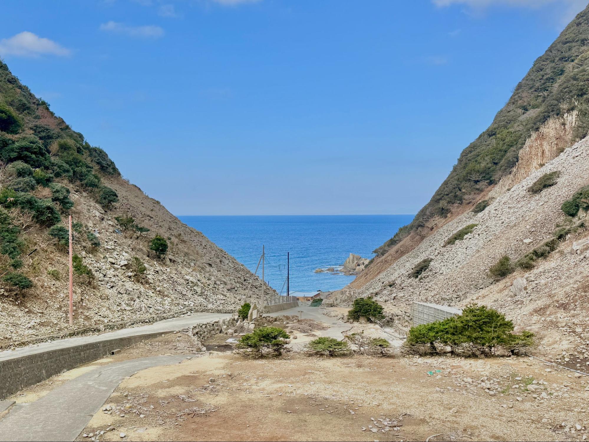 離開石廊崎後,沿著海岸線前行,穿過丸山隧道,在宇留井大橋下方,便是「落居海岸」。