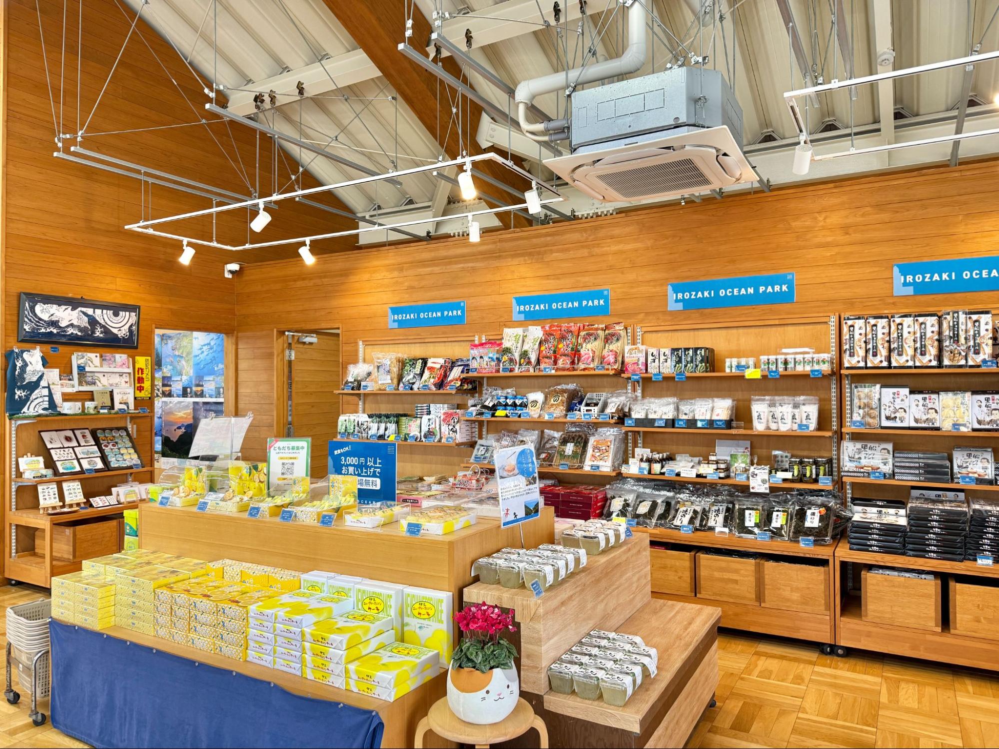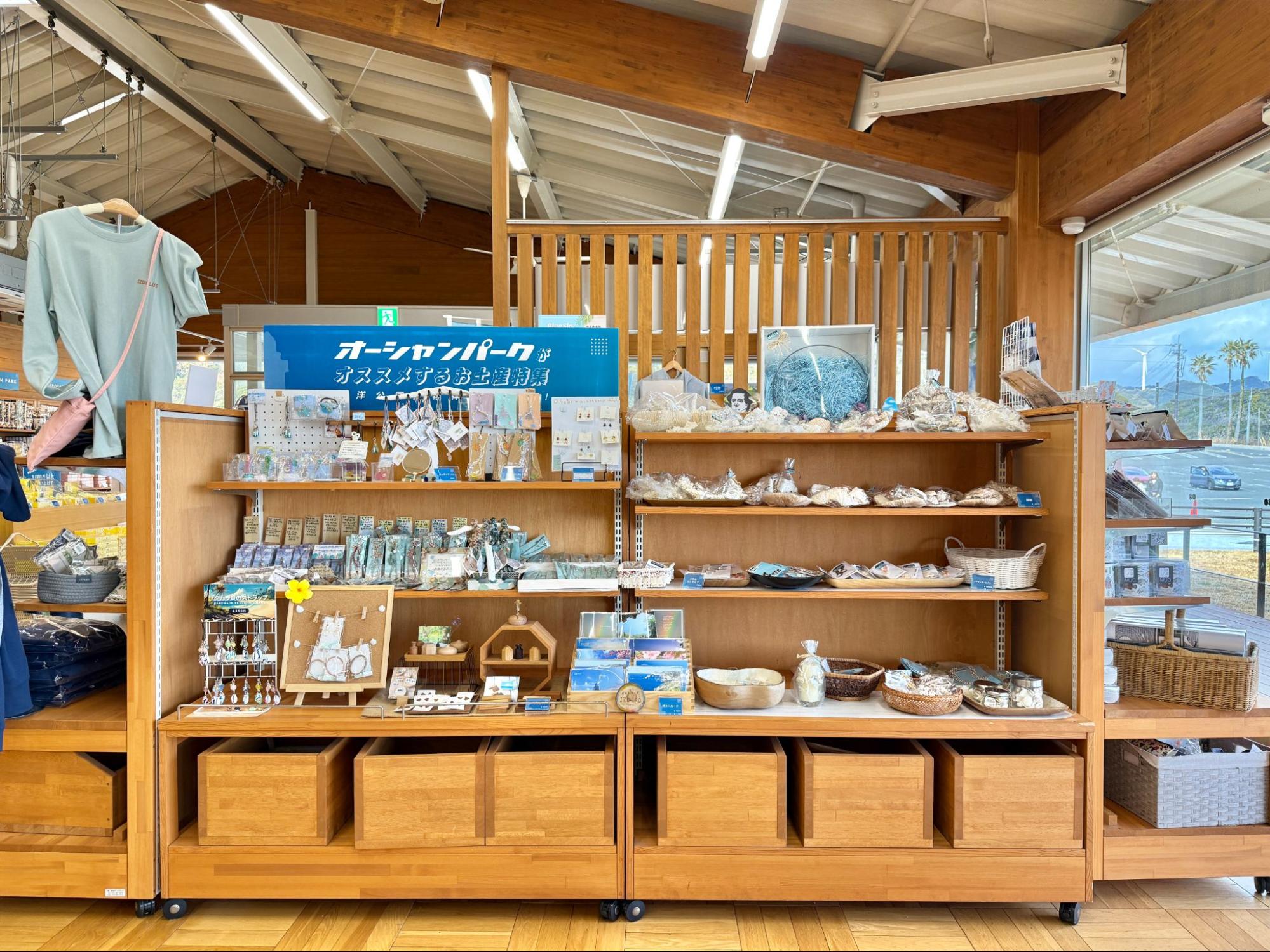 休憩所內販售伊豆地區的伴手禮,也有石廊崎海洋公園原創紀念品,例如包包、服飾、明信片等,都帶著海洋意象。