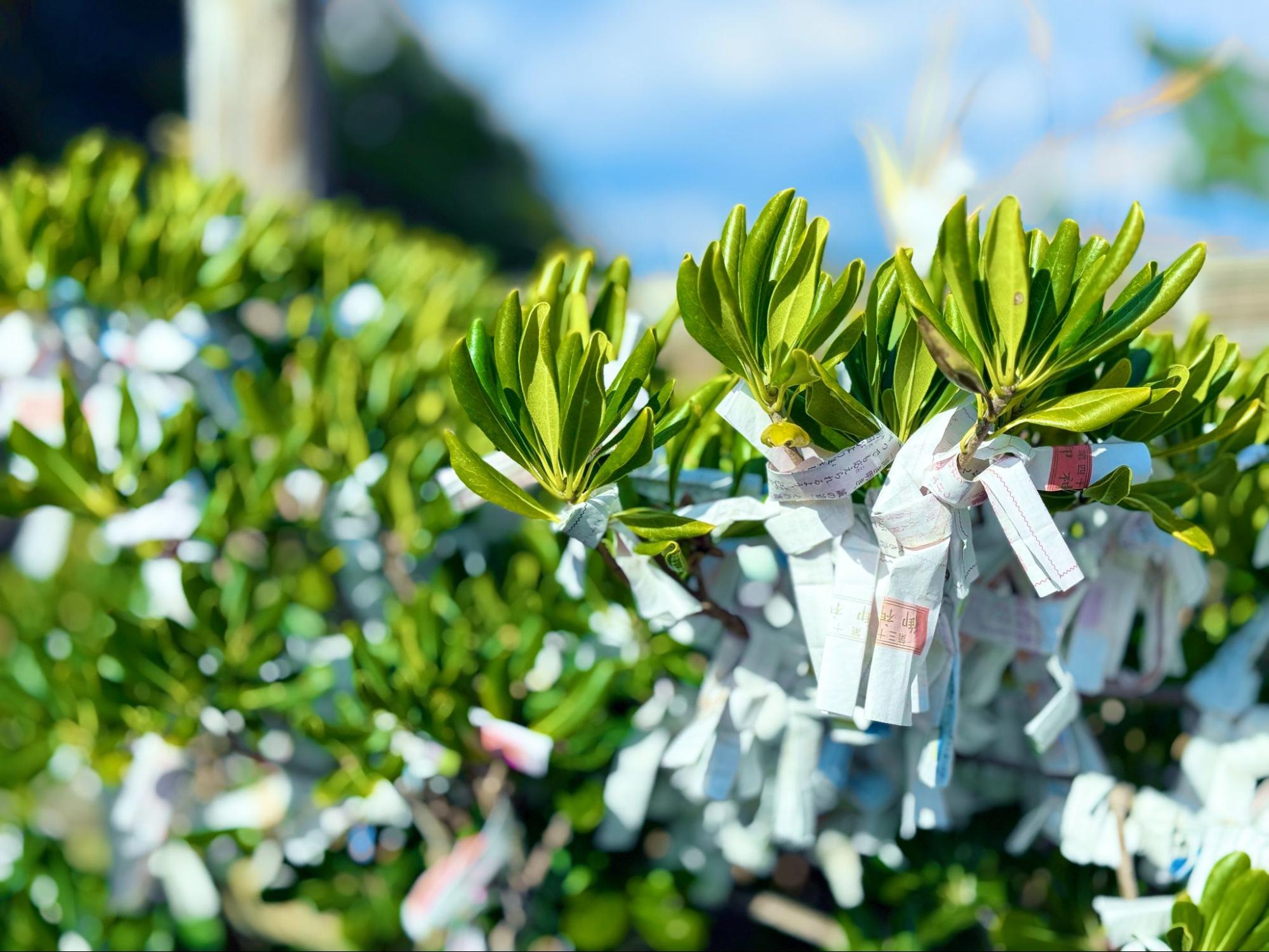 樹枝上綁著參拜者的許願籤詩,白色紙條被海風吹得輕輕晃動,看起來既可愛又溫柔。信仰與自然在這裡並行,沒有衝突。