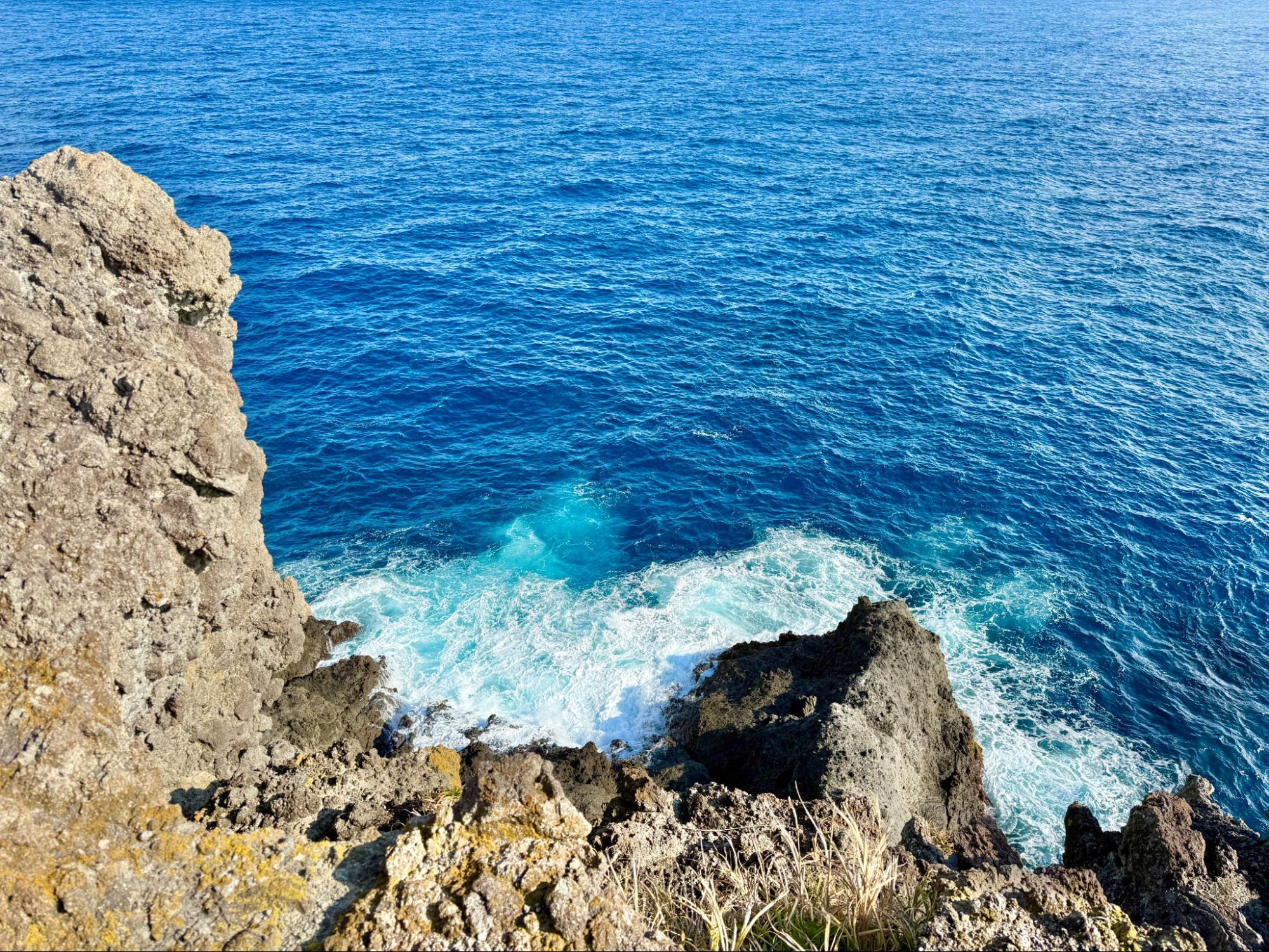 近岸是透明的藍綠,遠方則轉為深藍。海浪拍打岩壁,線條清晰而銳利,從高處俯瞰海面所帶來的震撼,很難用照片與語言完整呈現。
