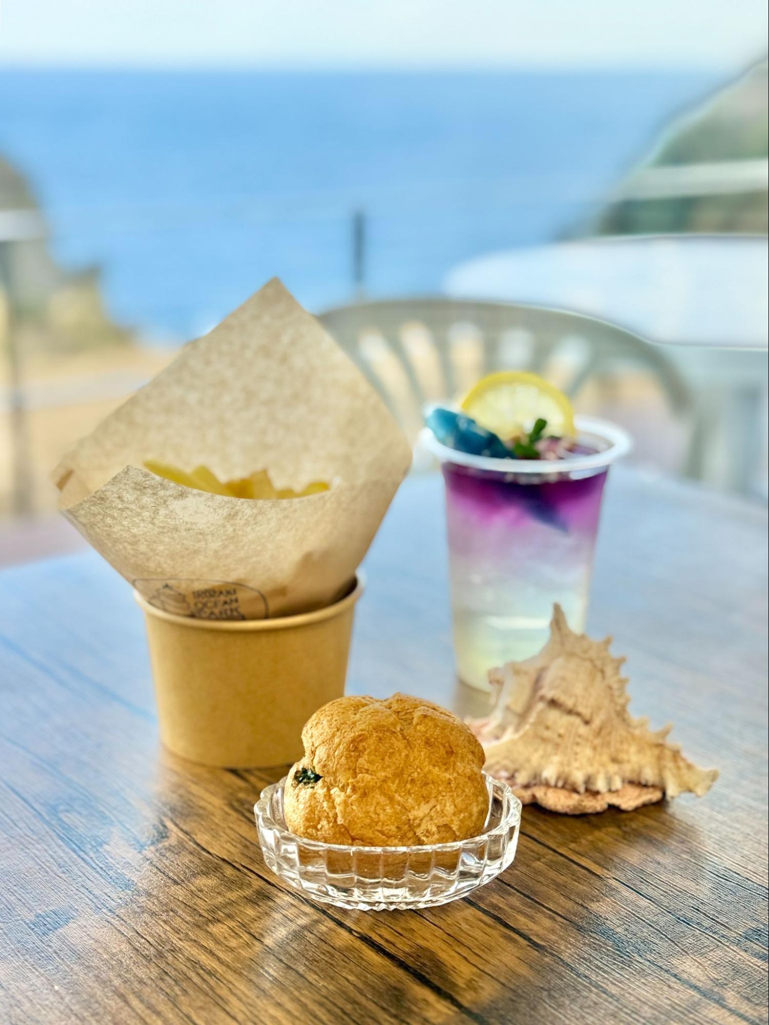 還有薯條與抹茶奶油泡芙,泡芙內餡因為冷凍的關係,口感像冰淇淋般滑順,店員還貼心詢問是否需要加熱,加熱後外層變得鬆軟,內餡仍保有如冰淇淋般的濃郁質地,在冷與熱之間,感受伊豆半島的好滋味。