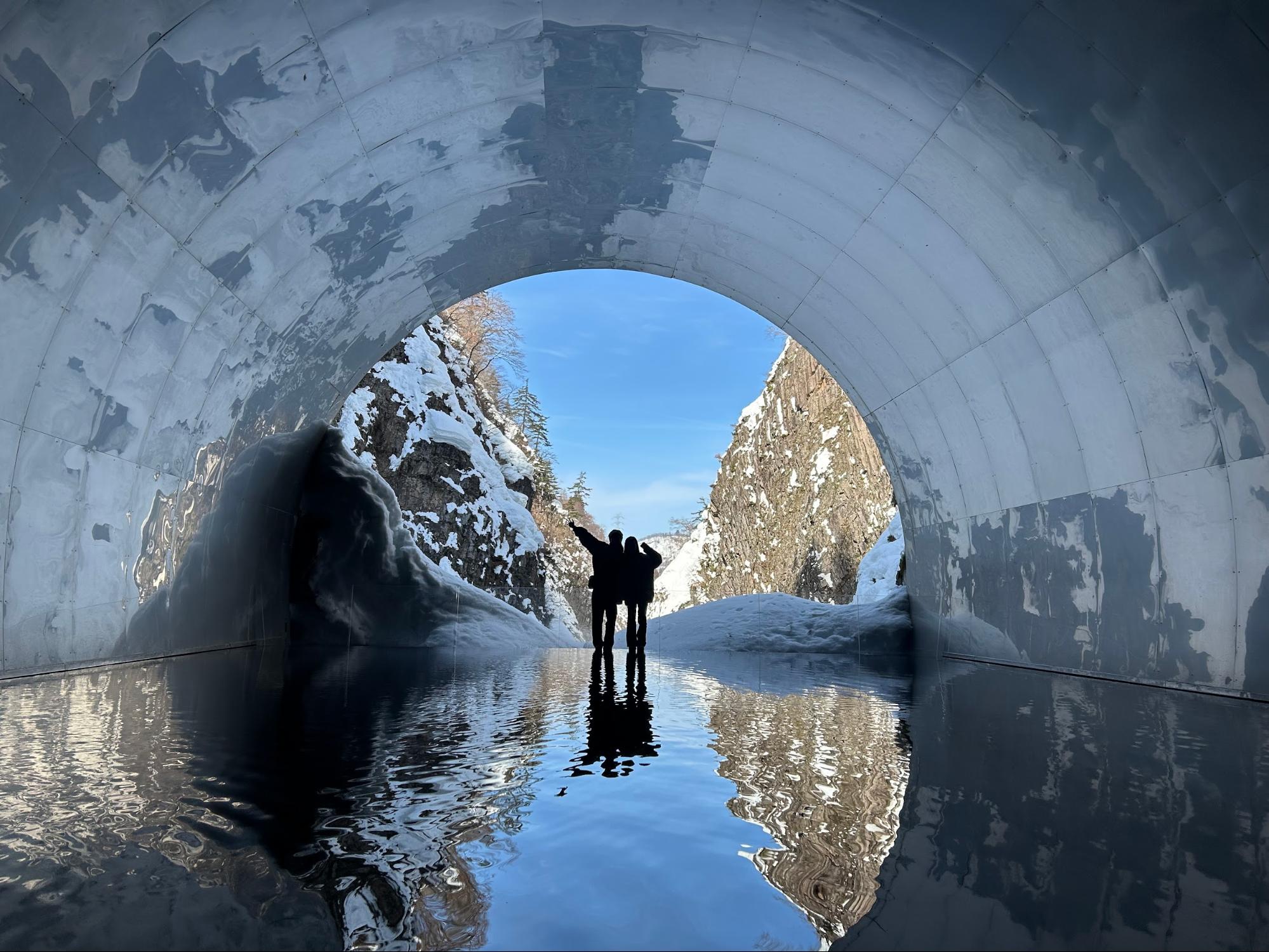 在清津峽天空步道的隧道末端,有一個極具特色的鏡面景觀窗,這是整個步道最受歡迎的拍照與沉浸式景點。 鏡面景觀窗將清津川的河水、兩側峭壁與隧道內的光影完整倒映,使景色似乎向下延伸,呈現出如同無邊無際的空間感。