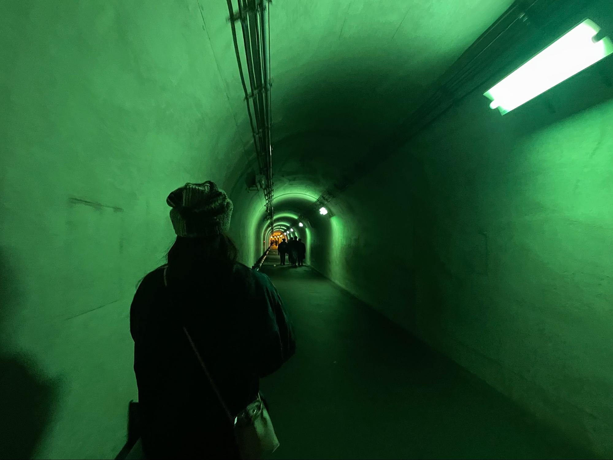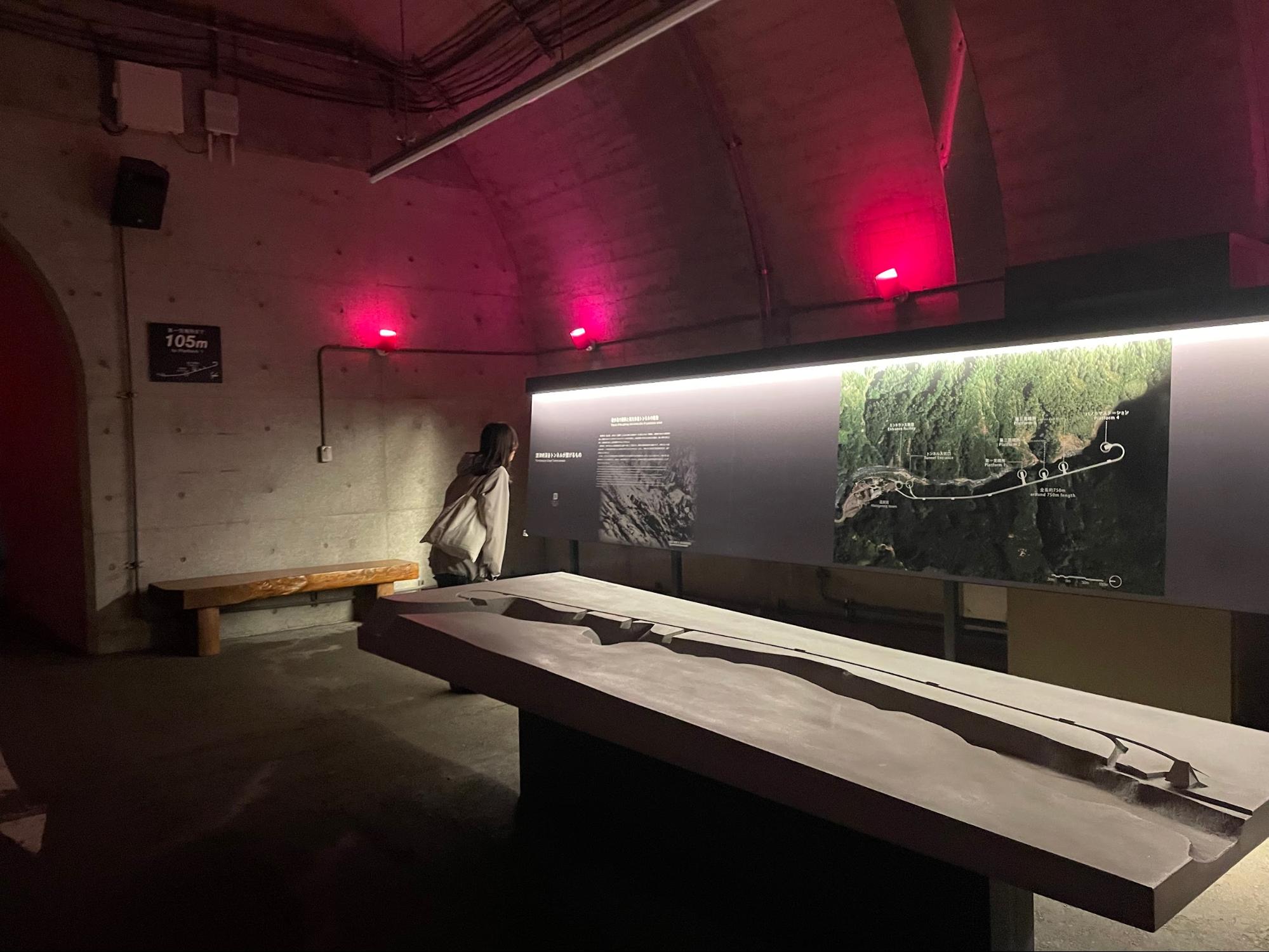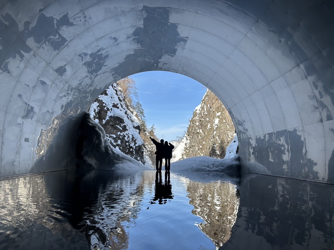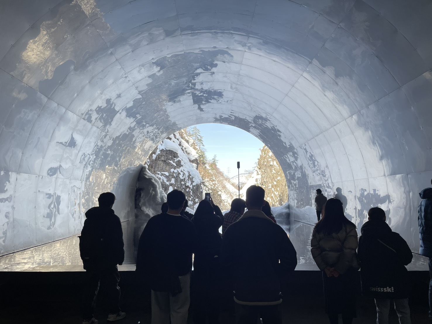 在清津峽的天空步道隧道內,除了可以安全地欣賞峽谷壯麗景色,最特別的是設置了藝術裝置,透過光影、反射與空間設計,讓旅人感受四季不同的峽谷風情。