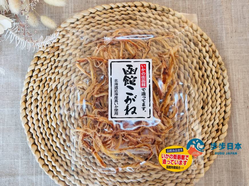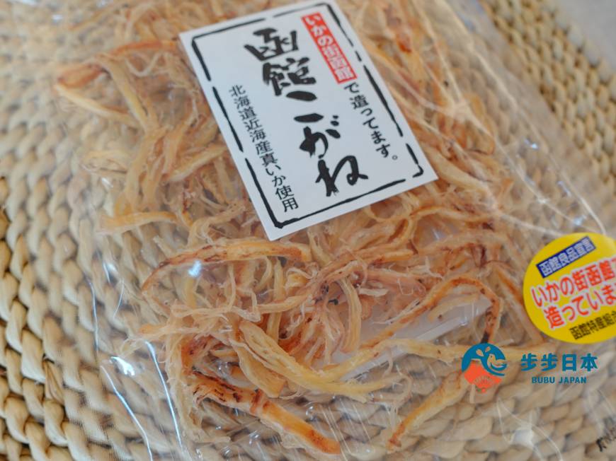 說到函館特產,不得不提到各式各樣魷魚(イカ)以及的昆布產品。「函館帶皮魷魚絲(函館こがね)」,最受觀光客喜愛的伴手禮之一,使用國產真魷製成,連皮以高溫慢慢燒烤後,再撕成魷魚絲,風味濃郁、口感香脆,不論是下酒菜,或者當做點心都適合!