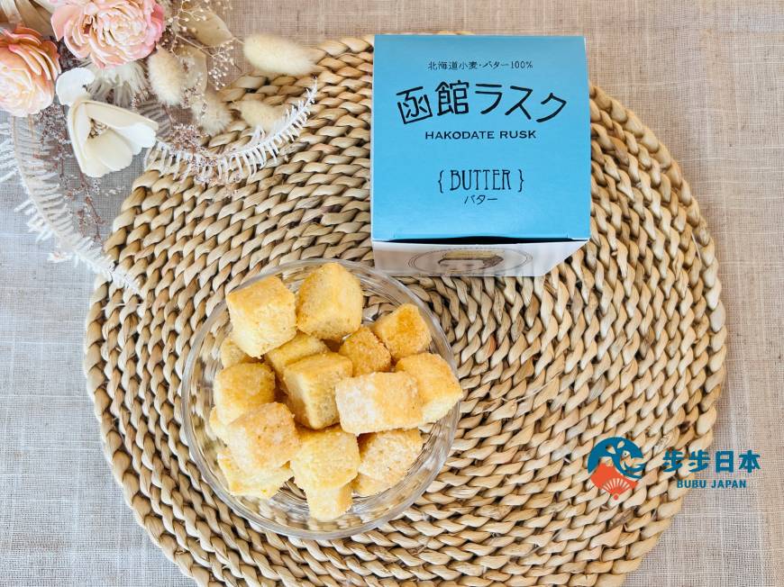 King Bake 的「函館 RUSK(函館ラスク)」主打外層酥脆、內層輕盈蓬鬆的絕妙口感。使用 100% 北海道產的小麥及奶油製作的麵包,雖然看似簡單的法式脆餅,但每一口都能感受到奶油與砂糖的香氣在口中擴散,那種迷人的滋味,讓人忍不住一口接一口,完全停不下來!