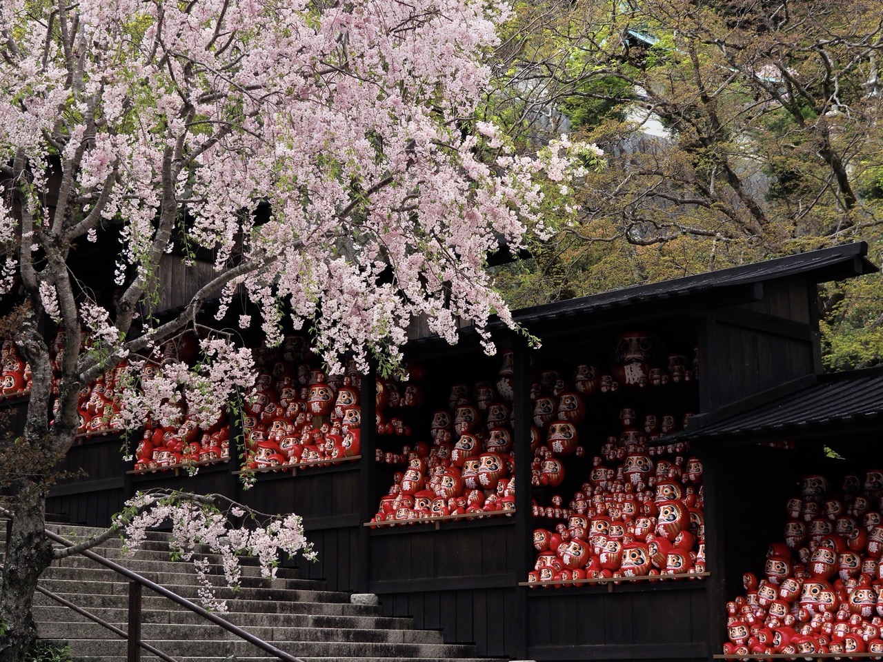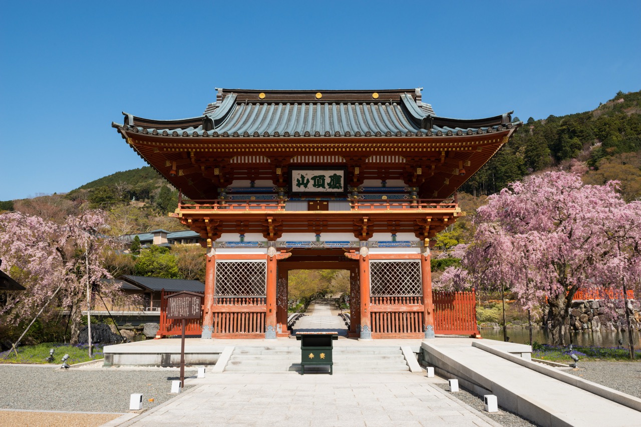 由於勝尾寺坐落於山中的,賞櫻時節通常比大阪市區來得稍晚。進入 4 月後,山門旁一株姿態優雅的垂枝櫻率先盛放,緊接著山櫻、八重櫻等各色櫻花次第綻放,將整座寺院妝點得繁花似錦。