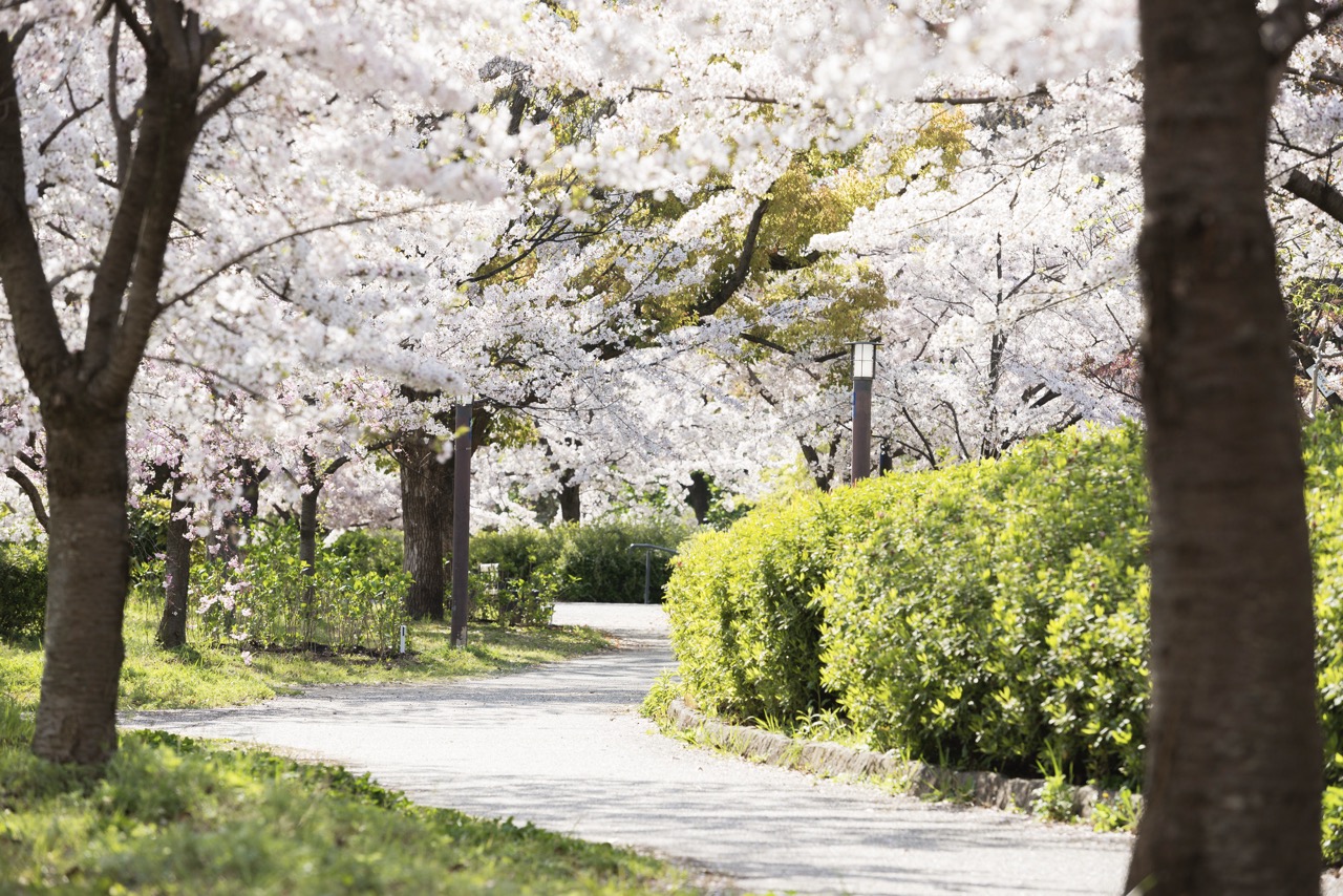 環池步道沿岸種植大量早開品種「越之彼岸櫻」,每年 3 月下旬便率先進入最佳觀賞期,是大阪府內最早可以賞花的地方。此外,4 月中旬還有八重櫻等品種相繼盛放,讓整個賞花季得以延續更長時間。池畔及博物館周邊一帶,共種植約 1,300 棵櫻花樹,每逢花季,美景令人心曠神怡。