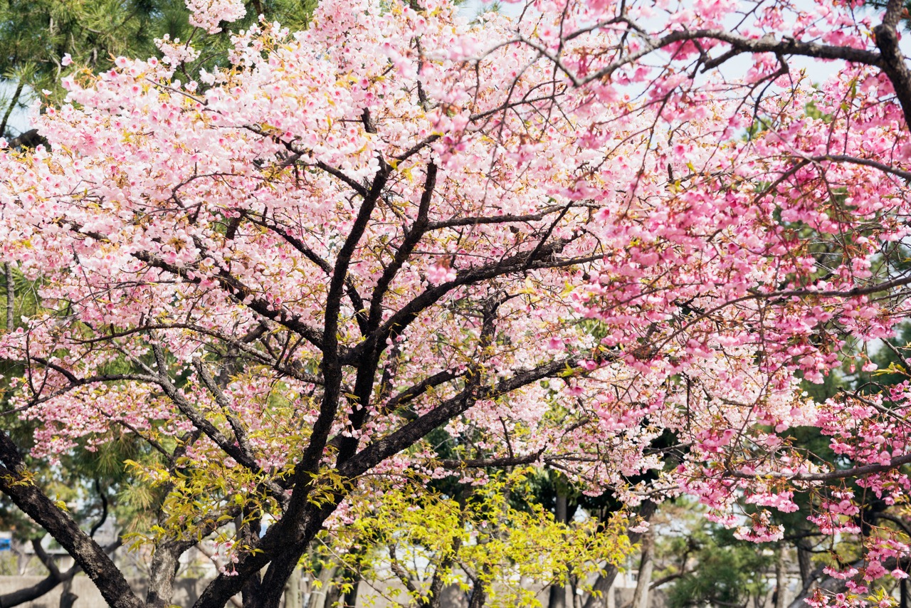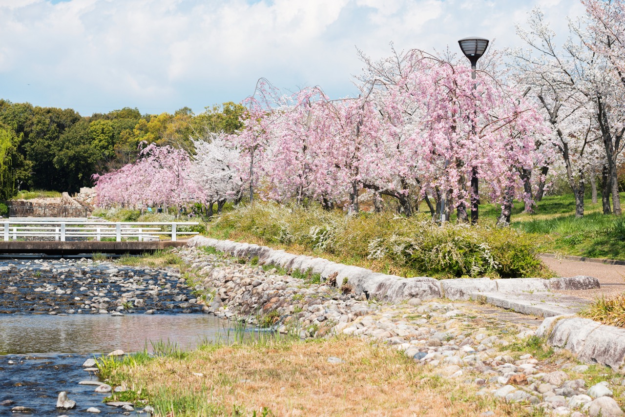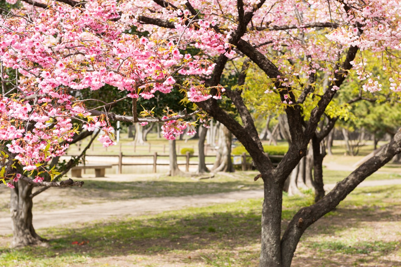 「花博紀念公園鶴見綠地」園內設有玫瑰園、杏仁樹林等多種不同類型的植物景區。櫻花從 2 月開始,便可欣賞到率先盛開的河津櫻,隨後至 3 月下旬的染井吉野櫻登場,隨著季節更迭,園內的櫻花景緻不斷變換,得以長時間享受賞花的樂趣。