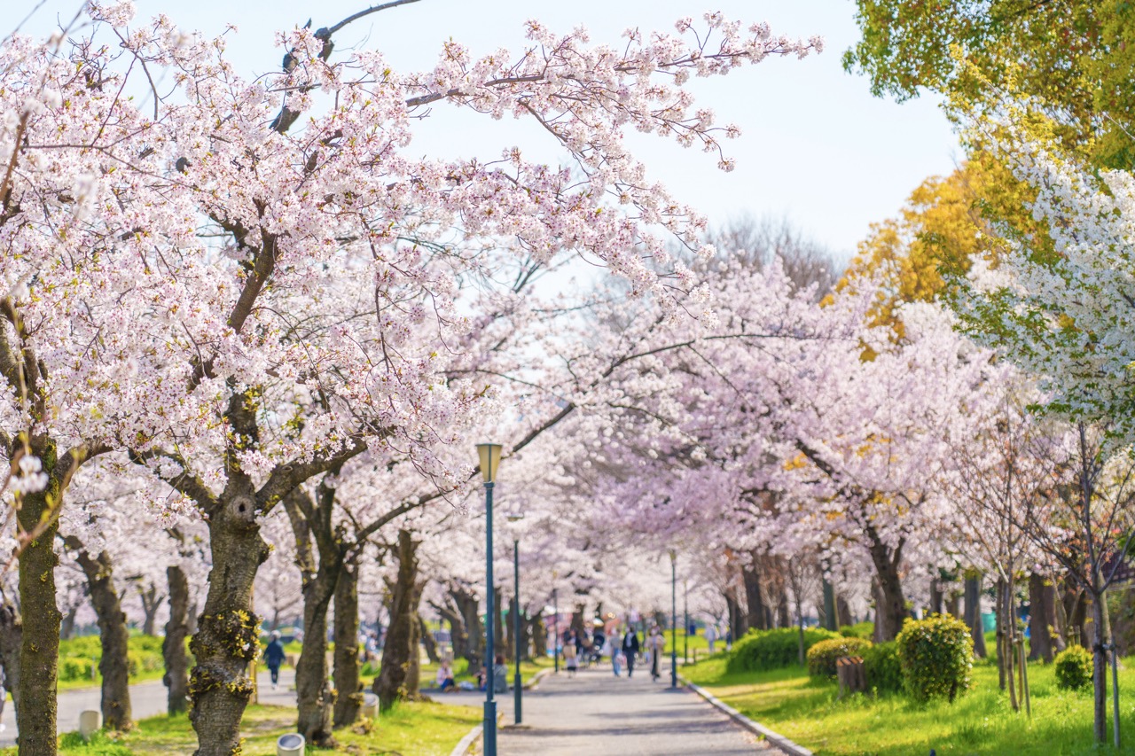 每年 3 月中旬起,園內種植的 12 種、約 5,500 棵櫻花樹依序盛開,彼岸櫻、寒緋櫻、染井吉野櫻等各式品種次第綻放,將整座公園染成一片迷人的粉紅色。