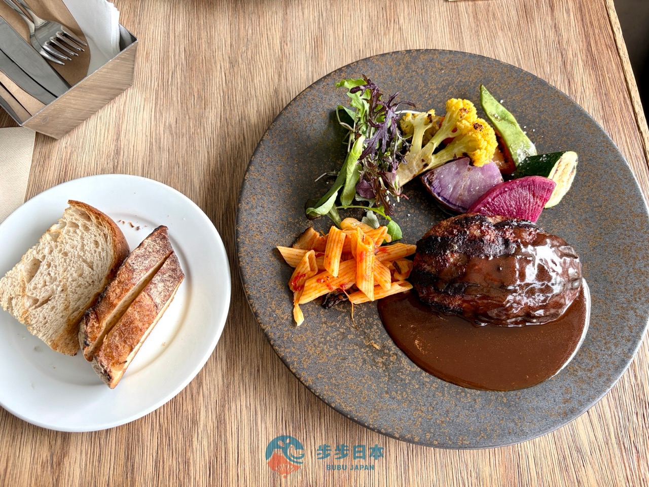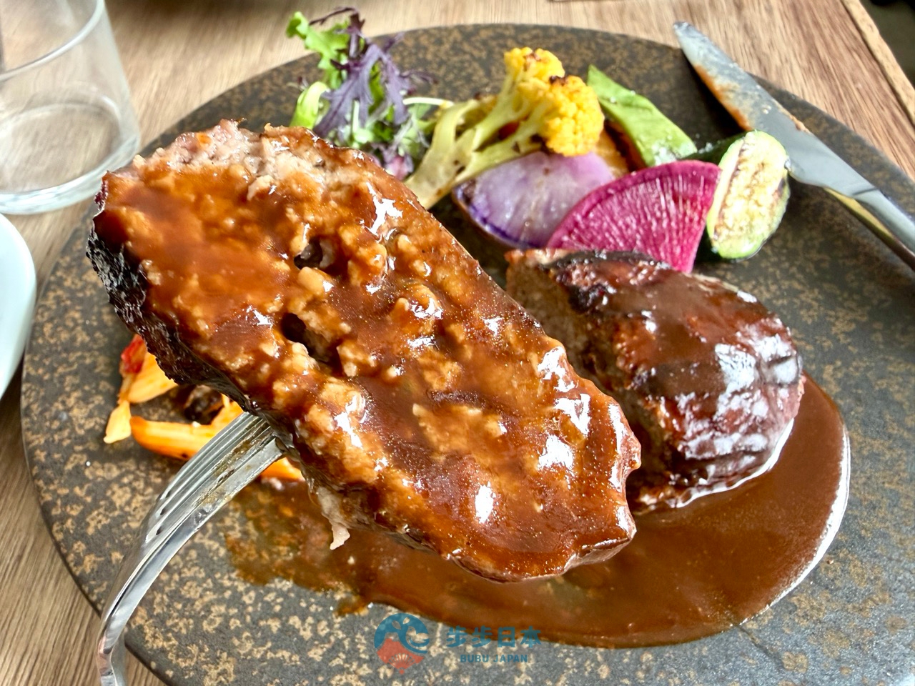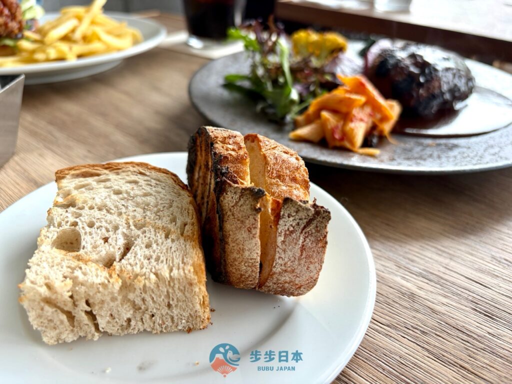 午餐選擇 「淡路島產碳烤牛肉漢堡排(淡路島産ビーフの炭焼きハンバーグステーキ焼き野菜添え)」。淡路島產的牛肉漢堡排一上桌就散發出濃郁的碳烤焦香,切開後肉汁瞬間滿溢,沾點漢堡排的醬汁後,那種入口即化的柔軟口感,忍不住一口接一口。碳烤野菜則以高溫封住了蔬菜原有的鮮甜與水分。