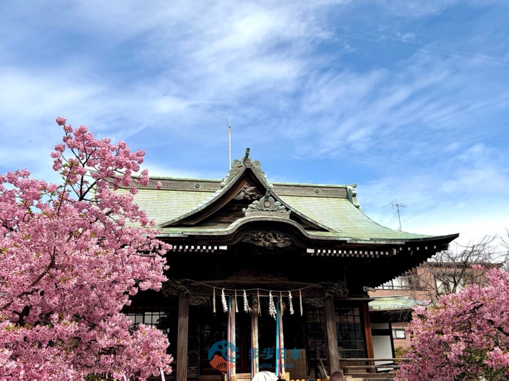 早上抵達「櫻新町站」,在早晨人潮較少時前往櫻神宮參拜。拍攝繫滿粉紅花帶的河津櫻畫面、領取夢幻的蕾絲御守與御朱印。