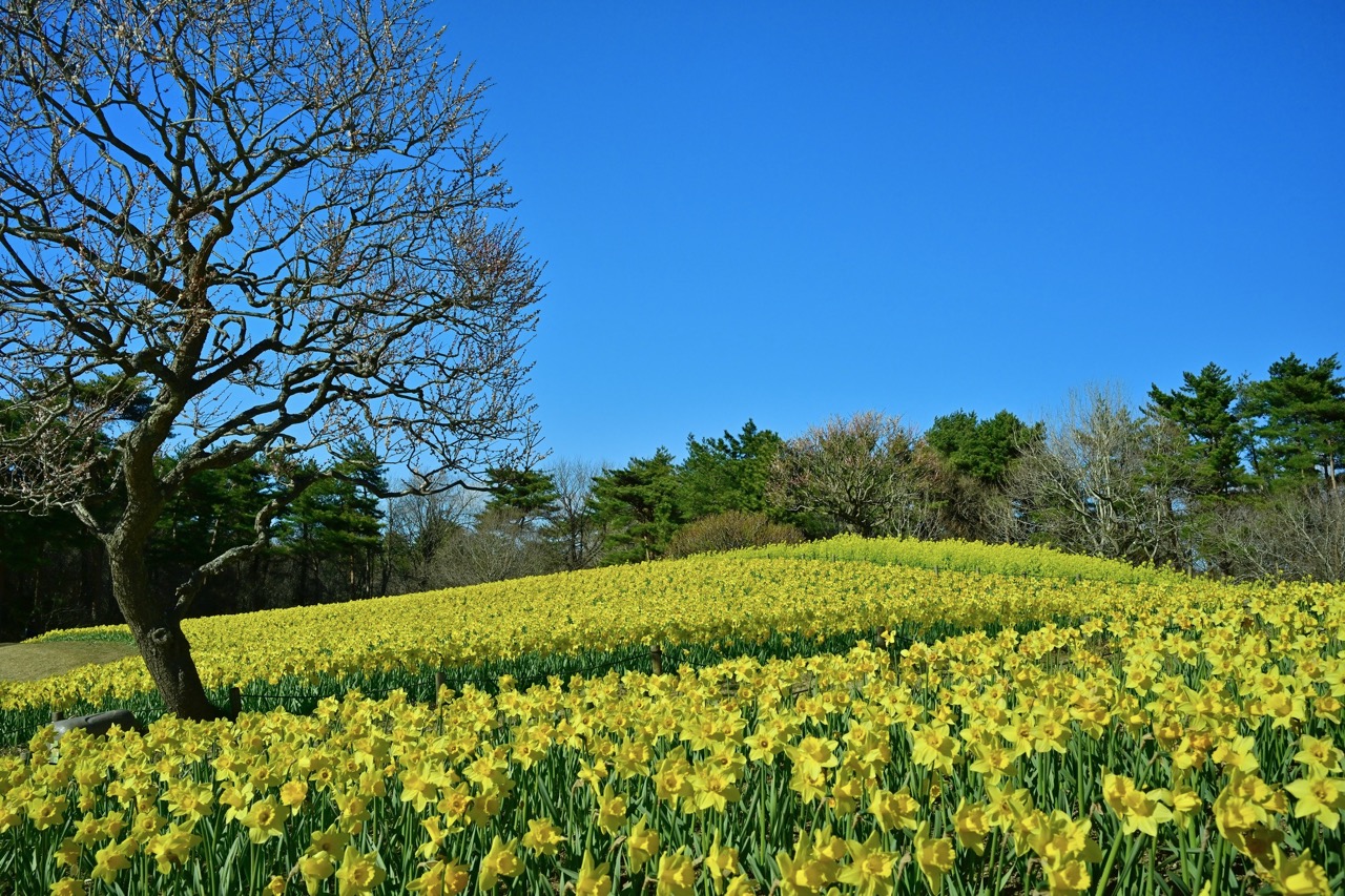 春季花卉接力從水仙(スイセン)揭開序幕。松林間盛開的白色與黃色水仙沿著步道綿延綻放,在微風中輕輕搖曳,是園區早春最清新優雅的景色之一。