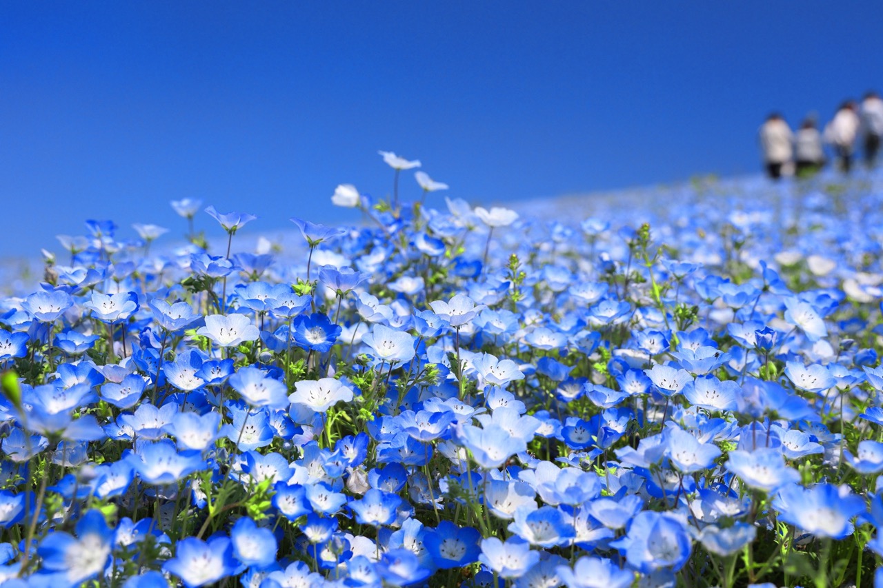 粉蝶花原產於北美,在日本被大規模栽培,逐漸成為日本春季代表性的花卉之一。國營常陸海濱公園的見晴之丘,因地形開闊,加上背後就是太平洋海景,讓粉蝶花花海看起來彷彿與天空連成一片,因此成為日本超人氣賞花景點之一。