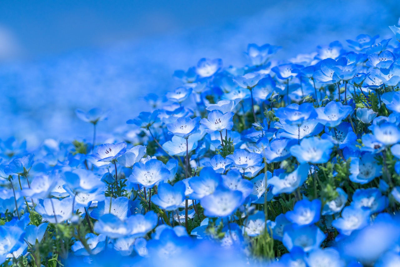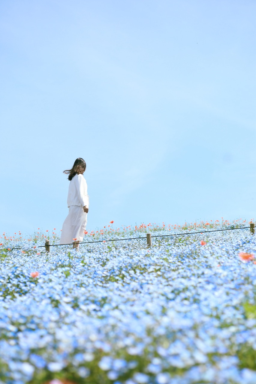 花朵盛開時,整片丘陵被淡藍色花朵覆蓋,彷彿與天空和太平洋相連,壯觀又夢幻。粉蝶花花朵小巧可愛,微風吹過時,整片花海化作藍色波浪,在丘陵上輕輕搖曳,是日本春季最具代表性的花海絕景之一,也是春天一定要看一次的日本風景。