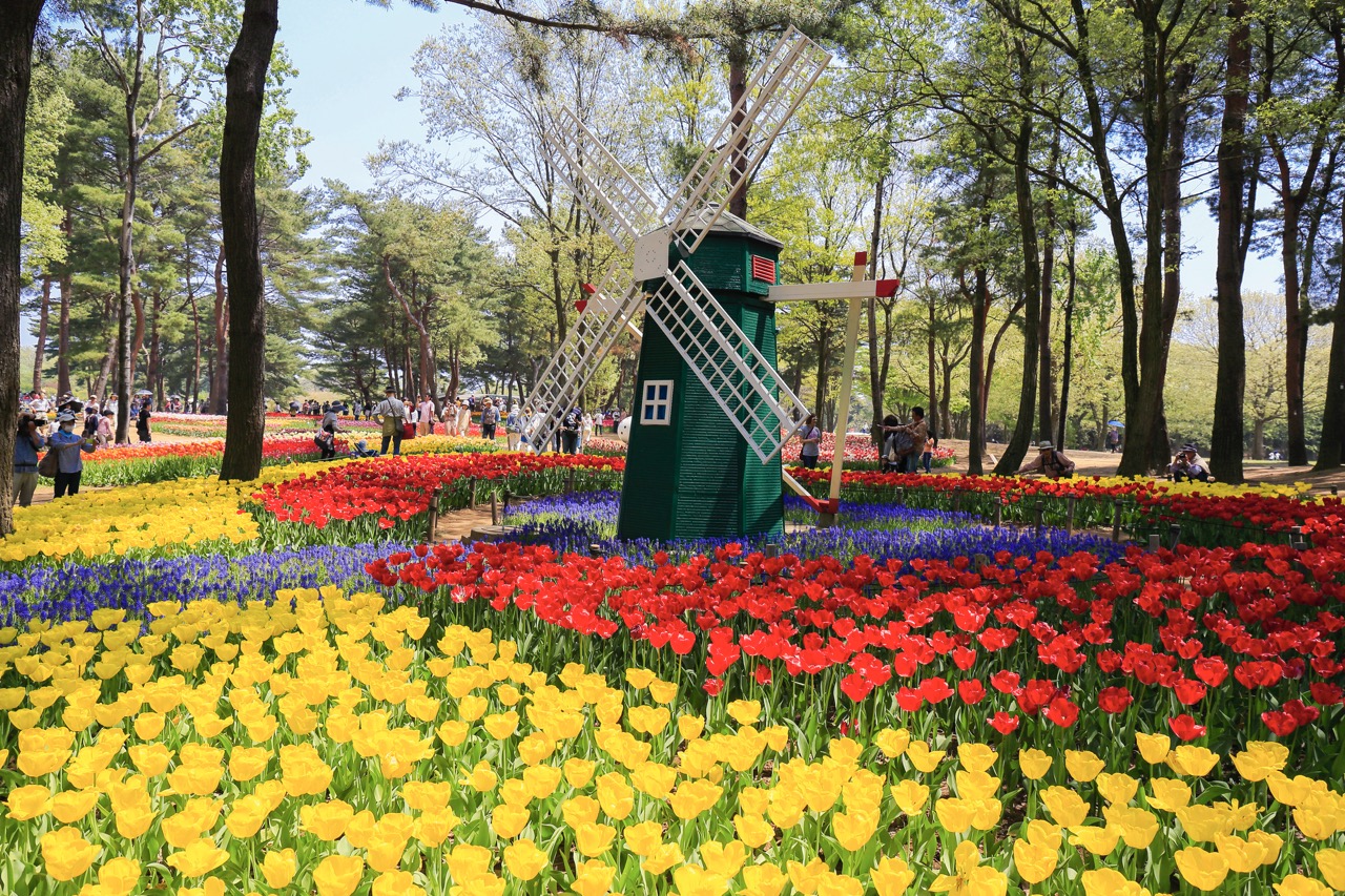 林間透出的陽光,讓色彩繽紛的鬱金香(チューリップ)更加浪漫,不同顏色的花朵讓花田宛如拼布,充滿童話色彩的夢幻景色,是春季非常受歡迎的拍照景點。