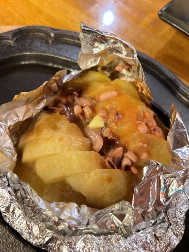 北海道居酒屋也常見「鹽辛奶油馬鈴薯(塩辛じゃがバター)」這道小菜,將鹽辛加在熱呼呼的奶油馬鈴薯上,雖然看起來有點普通,但入口後,便會被那鹹甜的溫和風味驚豔!